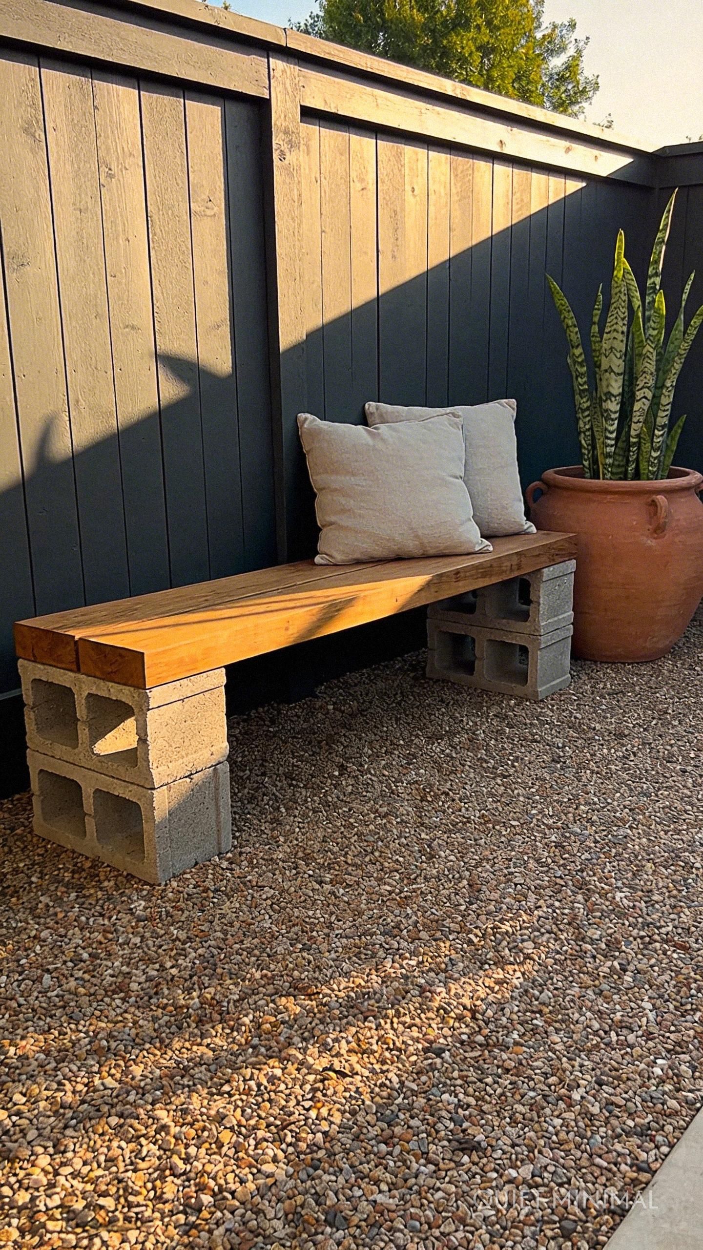 Key Takeaway: Construct a high-style bench for a fraction of the cost using cinder blocks and wood beams. It’s a functional, 30-minute project with major design credibility.