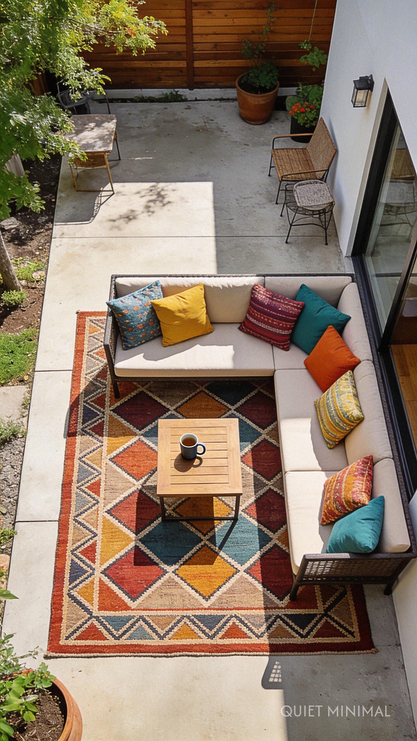 Key Takeaway: Use an outdoor rug and pillows to “furnish” your backyard. These textile elements are essential for adding softness, color, and a comfortable, room-like feel.