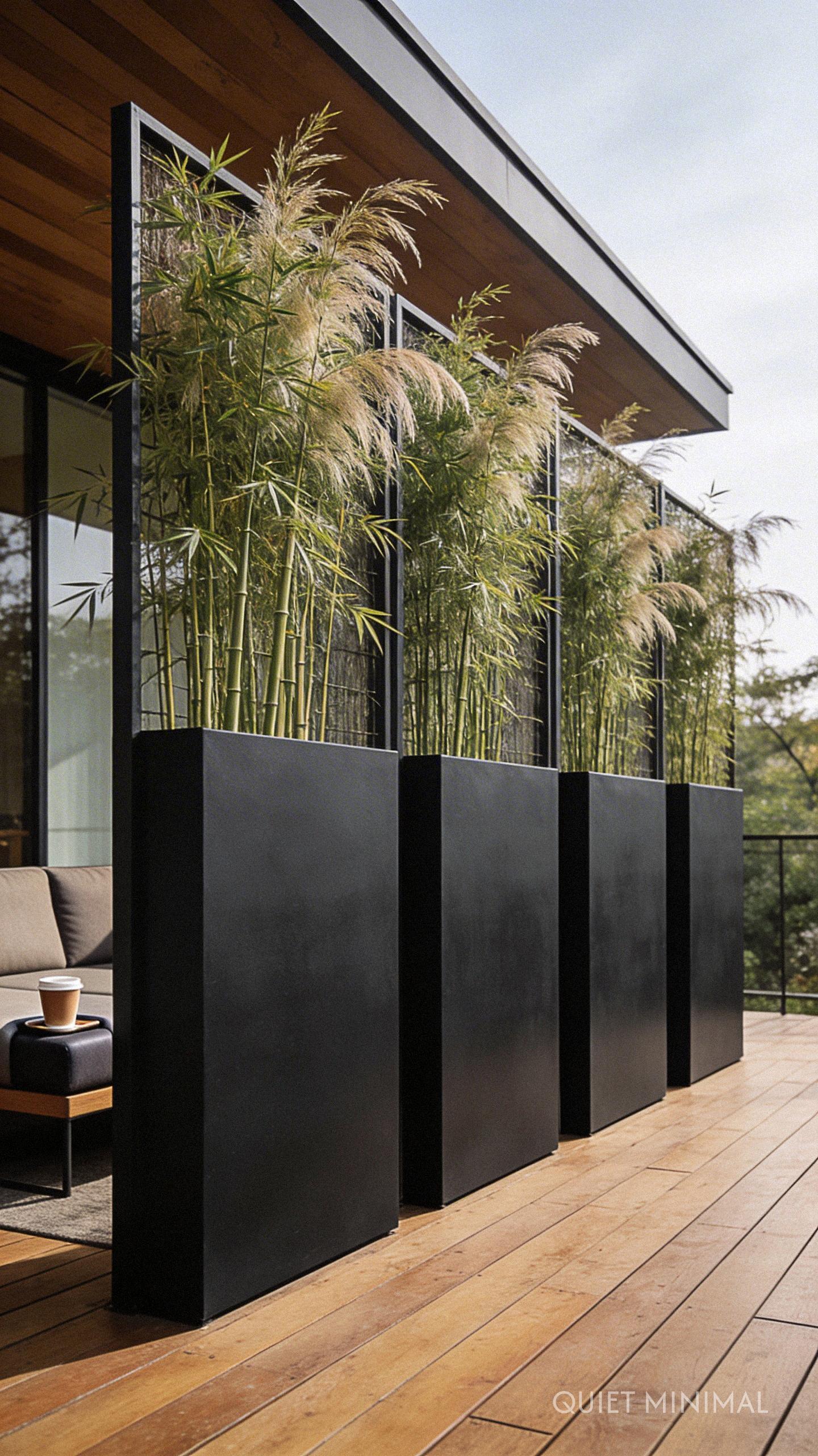 Key Takeaway: Large planters filled with tall grasses or clumping bamboo are a flexible, non-permanent solution for creating privacy screens on patios and decks that you can move as needed.