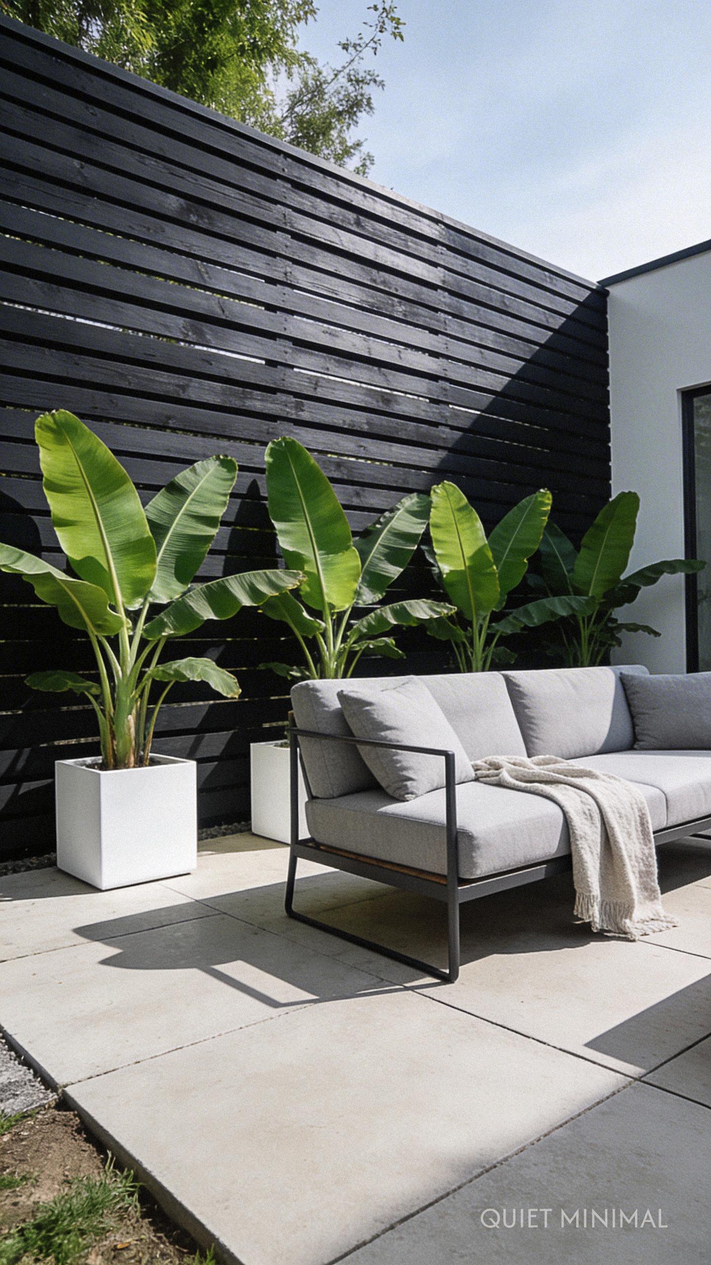 Key Takeaway: A horizontal slat fence provides immediate, stylish privacy and acts as a modern architectural backdrop for your plants and furniture.