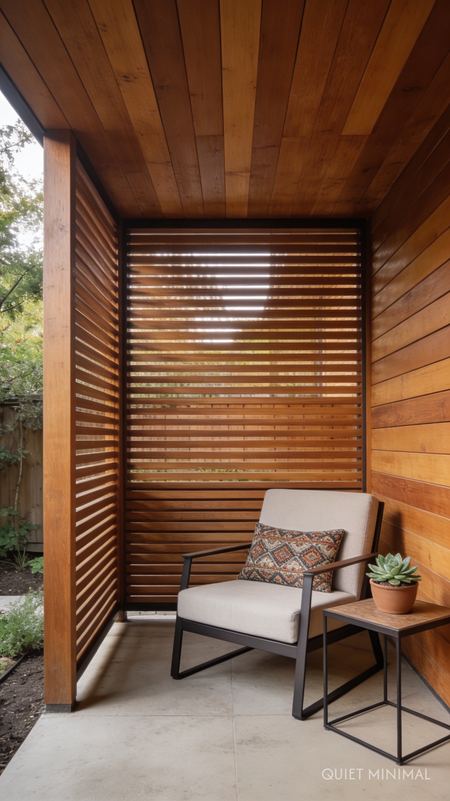 Whether you want to hide an unsightly view (like your neighbor’s trash cans) or create a more intimate-feeling nook, a privacy screen is an elegant solution. A horizontal slat screen made from cedar or pressure-treated pine is a classic mid-century modern design that you can build in a weekend. The design is simple: sink two or more 4×4 posts into the ground with concrete and attach horizontal 1×4 or 1×6 boards, leaving a small, consistent gap between them. It adds architectural interest, provides privacy without feeling like a solid wall, and serves as a beautiful backdrop for climbing plants.