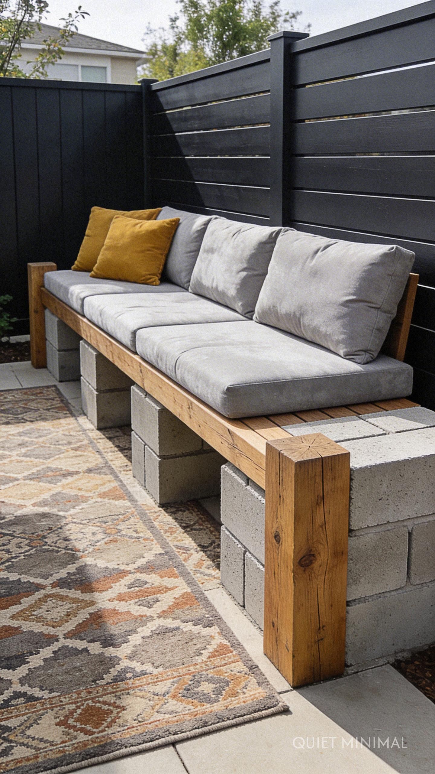 Forget expensive, matched patio sets. For a seating solution that is modern, affordable, and incredibly easy to assemble, turn to the humble cinder block. Arrange standard concrete blocks at either end of your desired bench length, leaving the holes facing out. Slide 4×4 lumber posts through the openings to create the seat. You can leave the blocks raw for an industrial-chic vibe, or paint them a crisp white, black, or a bold color to match your aesthetic. Top with plush outdoor cushions and pillows for comfort and style.