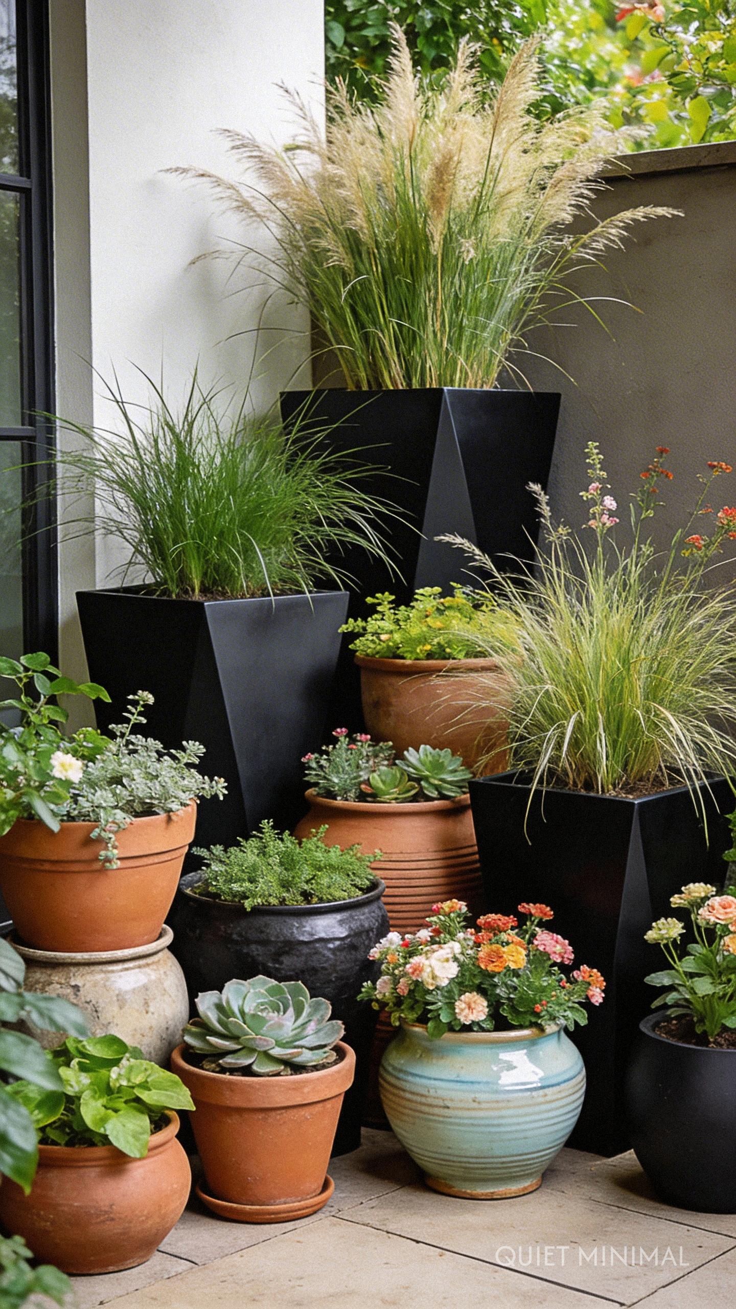 Key Takeaway: A collection of potted plants adds dynamic life and color. Grouping varied, stylish containers is more impactful and flexible than in-ground planting.