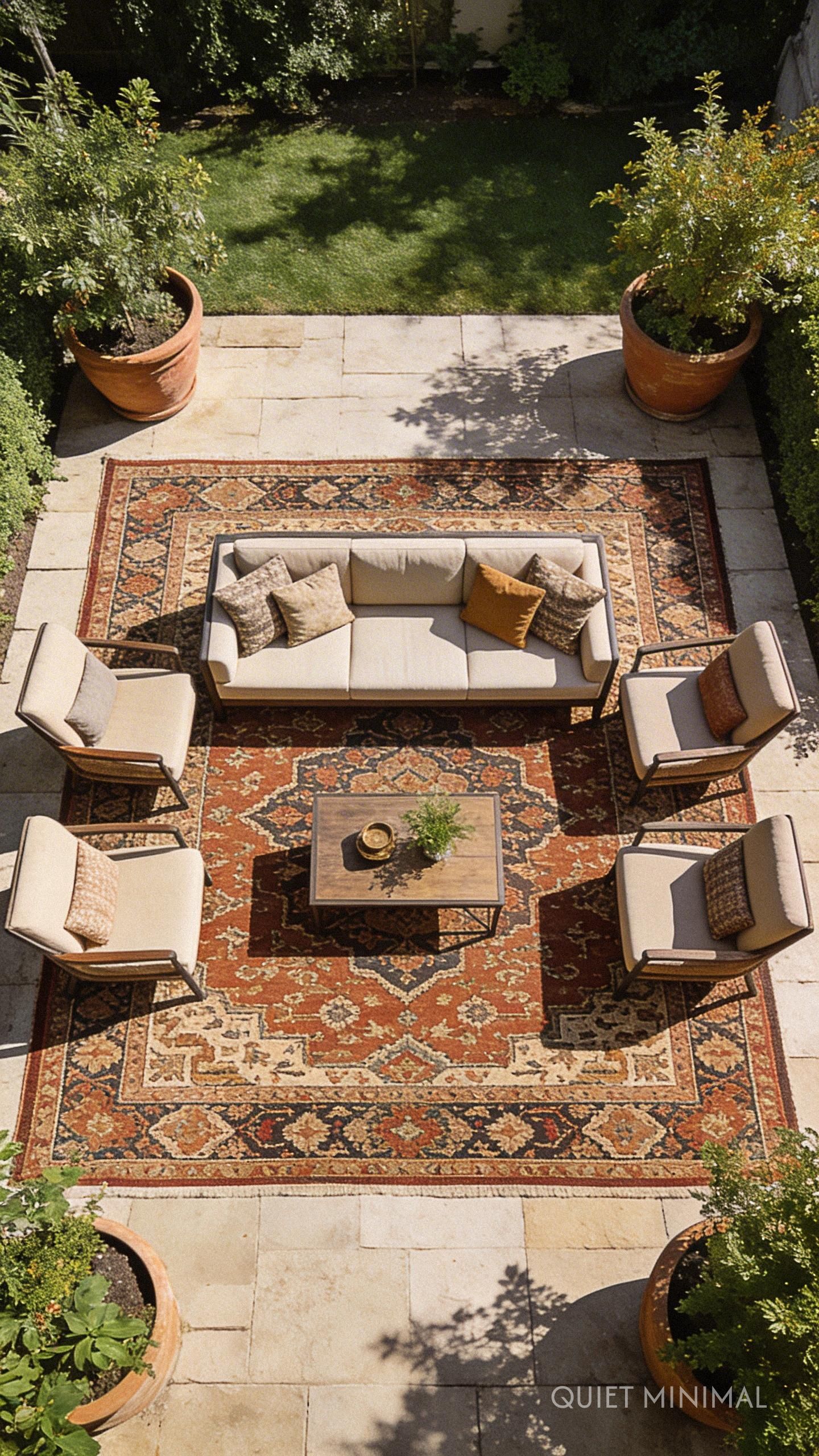 Key Takeaway: Use outdoor rugs, pillows, and throws to add color, texture, and comfort, making the patio feel like a true extension of your interior decor.