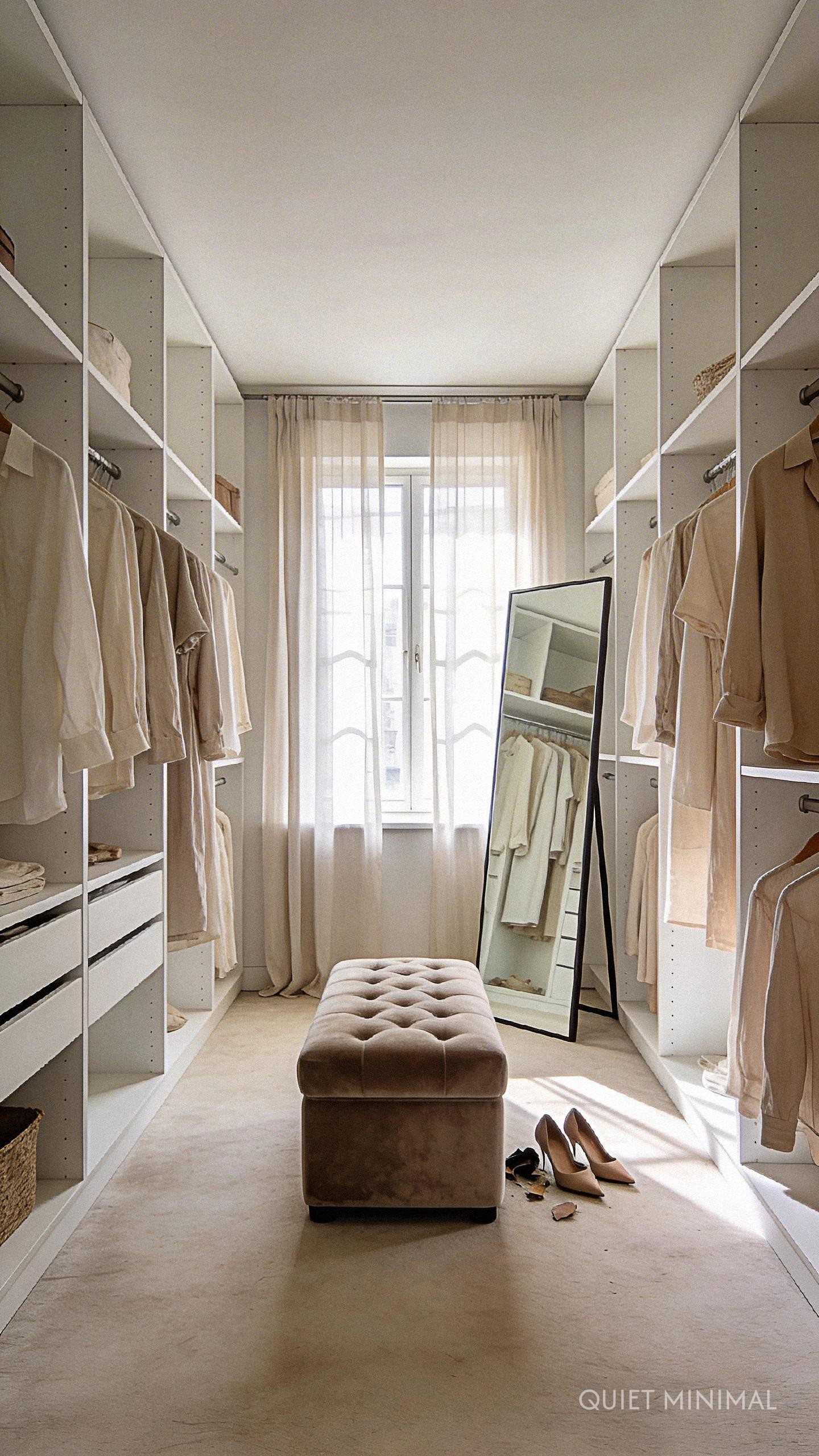 You don’t need expensive custom joinery to achieve this look. utilize IKEA PAX systems or open garment racks for an airy, industrial feel. Add a velvet ottoman or a refurbished mid-century chair in the center for putting on shoes. A full-length mirror leaning against the wall and a dedicated vanity area for jewelry storage will make getting ready feel like a ritual rather than a rush.