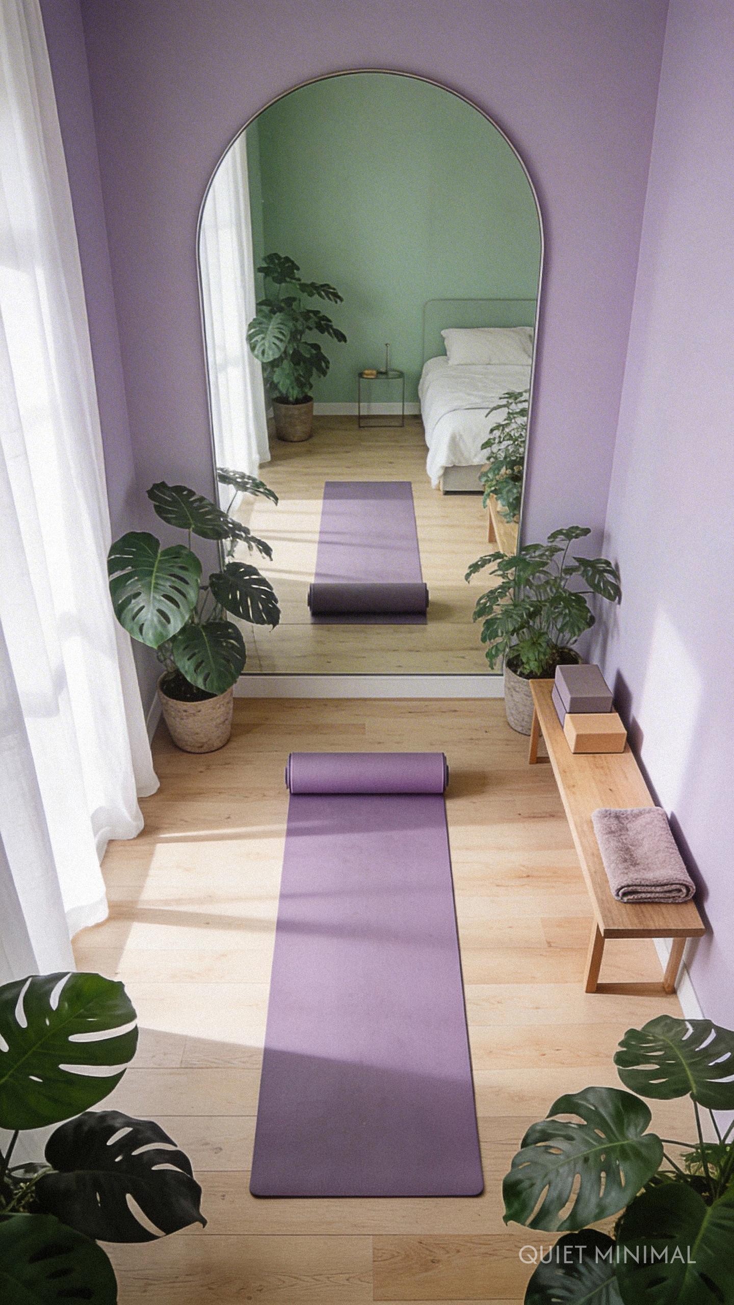 Keep the decor minimal to avoid distraction. A large mirror can help check your form, while low-profile storage can hide weights, blocks, and bands. Consider the sensory experience as well: add an essential oil diffuser, dimmable smart bulbs to change the mood, and perhaps a Sonos speaker for your ambient playlists. Plants are essential here—lush greenery purifies the air and reinforces the connection to nature.