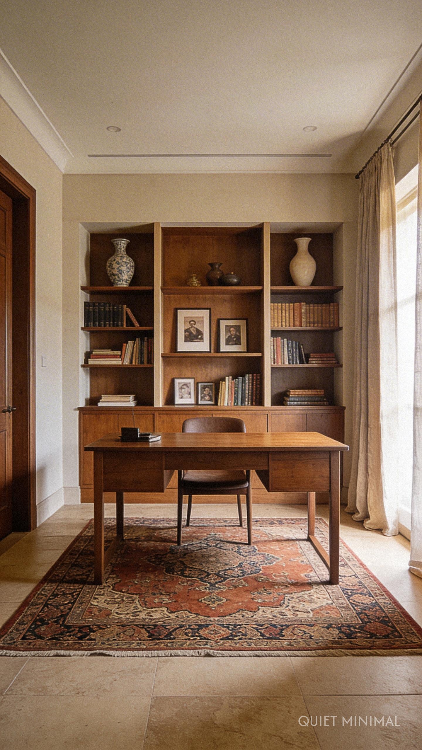 Key Takeaway: Soften the corporate feel with textiles and vintage rugs. Position your desk to command the room rather than pushing it into a corner.