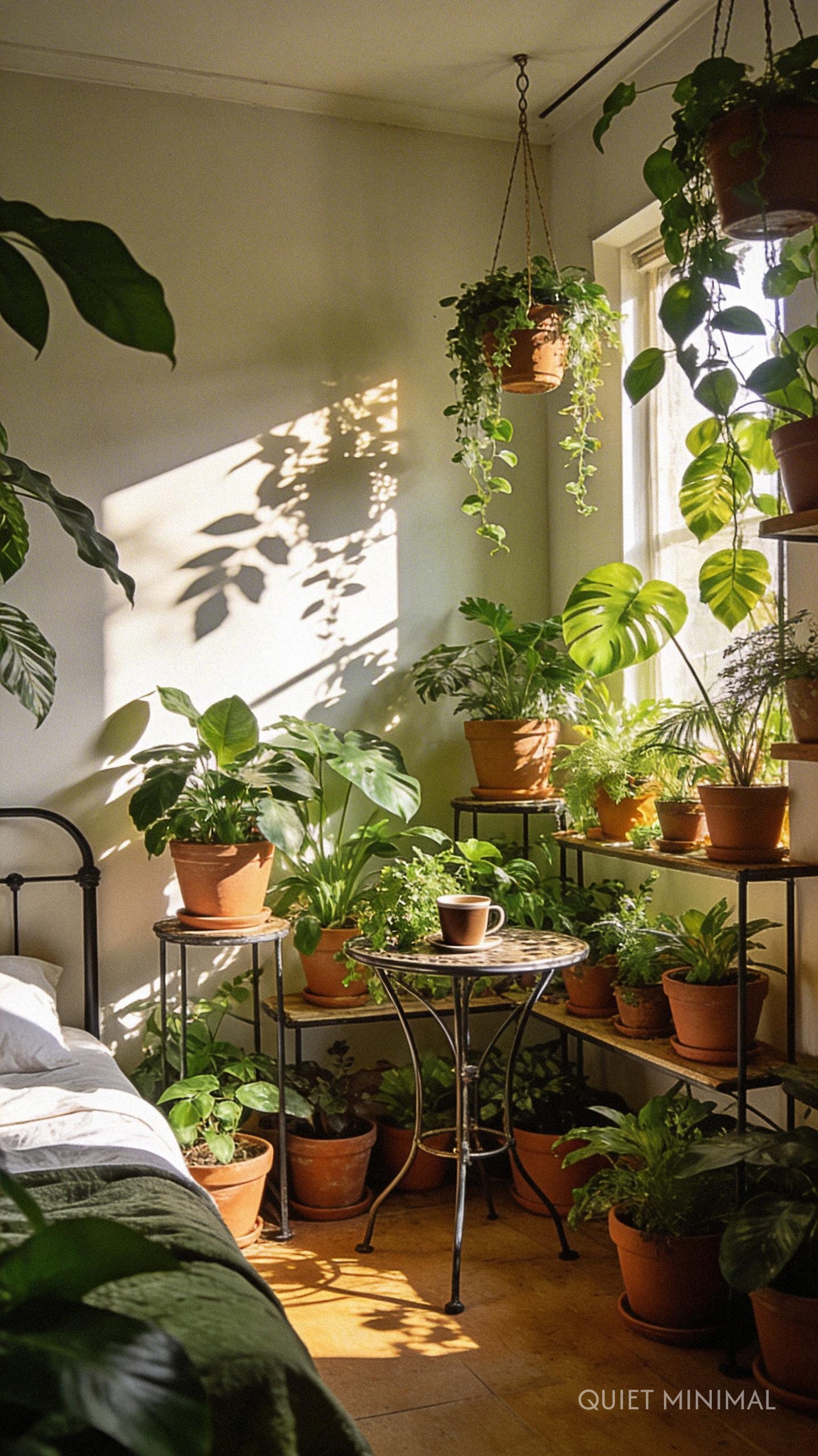 Key Takeaway: Utilize vertical space for plants to create a lush, immersive environment. Add a small seating area to enjoy the improved air quality and calm.