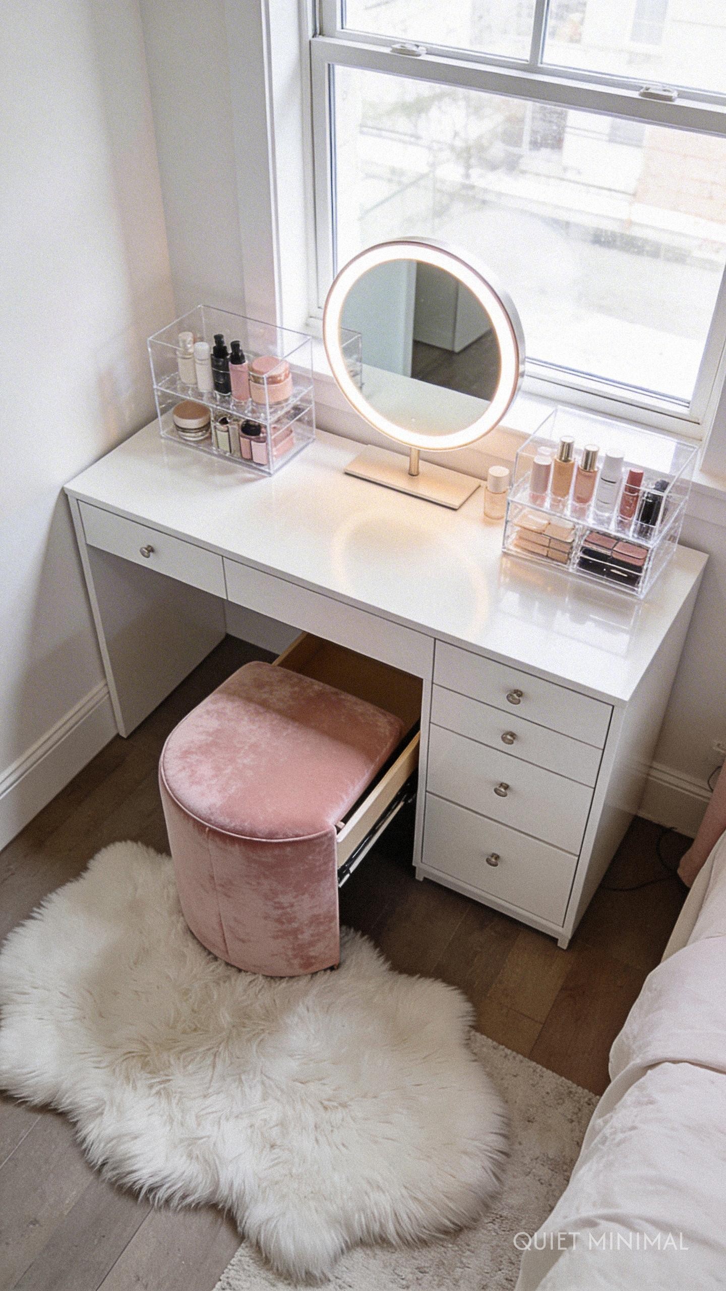 Key Takeaway: Prioritize lighting and organization. A dedicated vanity clears bathroom clutter and turns skincare into a luxurious daily ritual.