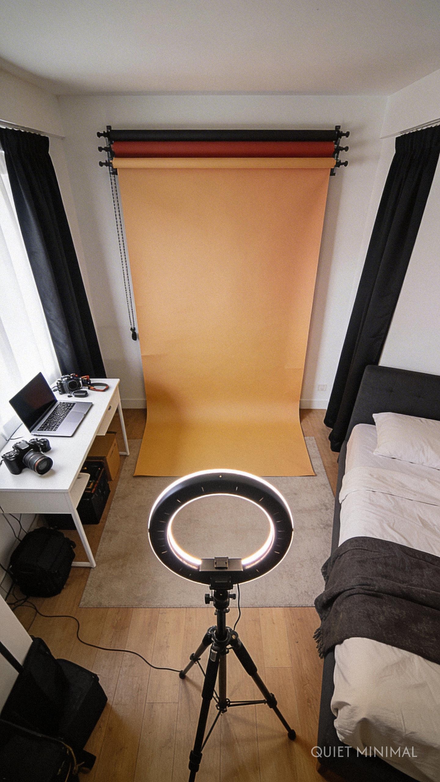 Key Takeaway: Control the light with blackout curtains and keep one wall blank for backdrops. Keep your “set” ready to go to minimize friction in your creative process.