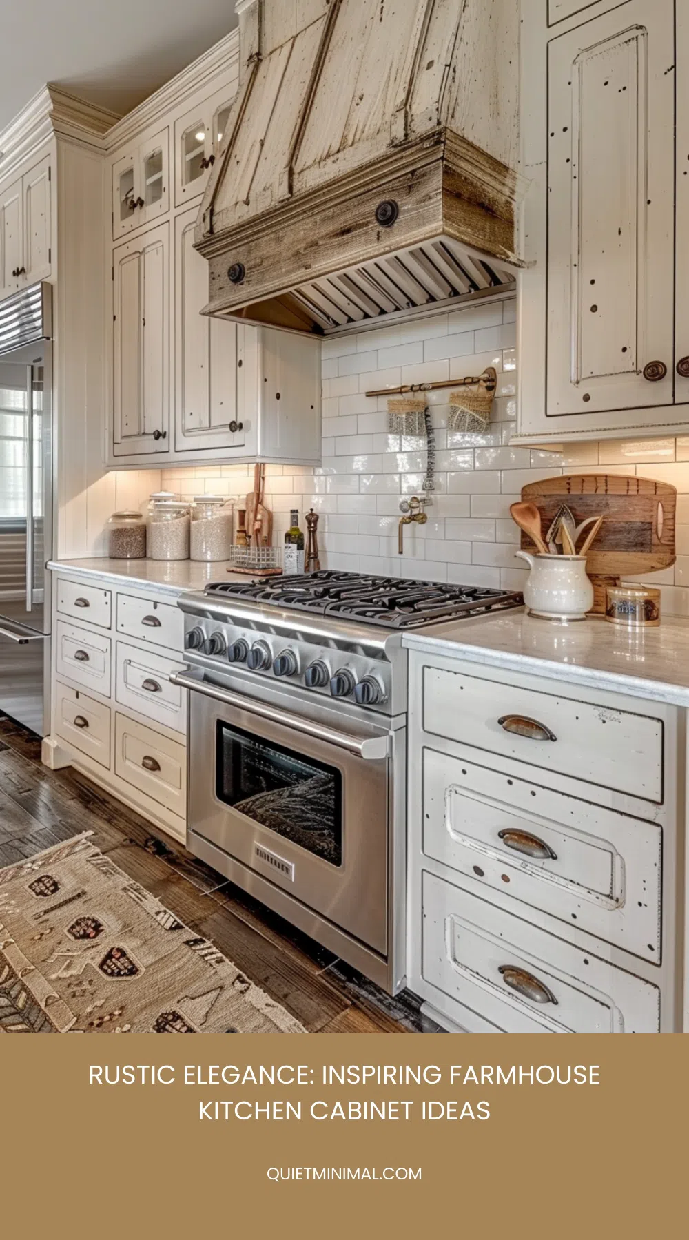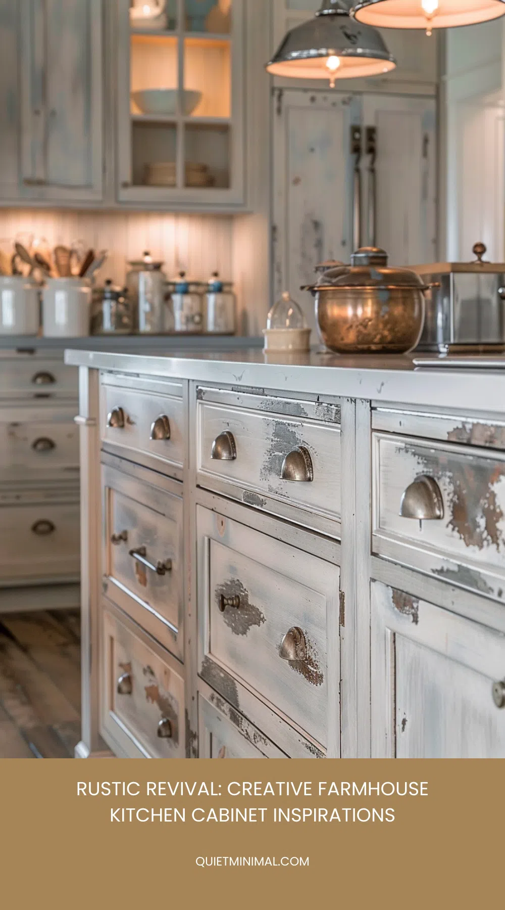 Hardware is another detail that shouldn’t be overlooked. Opt for vintage-style pulls and knobs, such as wrought iron or antique brass, to complete the rustic aesthetic. These small touches will seamlessly tie your distressed wood cabinets into your farmhouse kitchen.