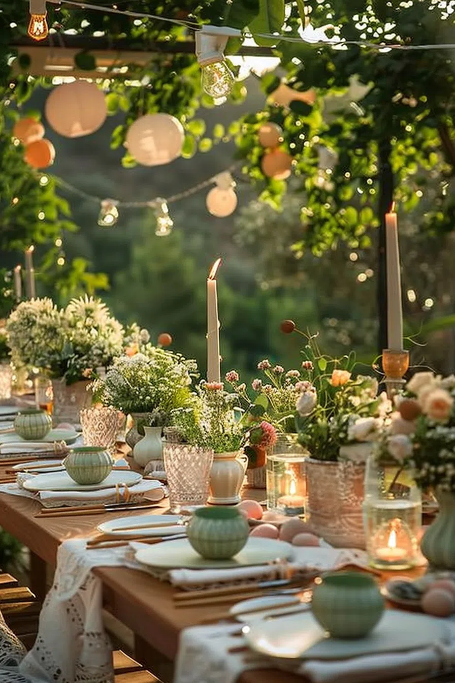 Choose pastel-colored plates, cups, and napkins to add a soft, elegant touch. It’s a subtle way to incorporate color without overwhelming the senses. - Rustic Centerpieces: