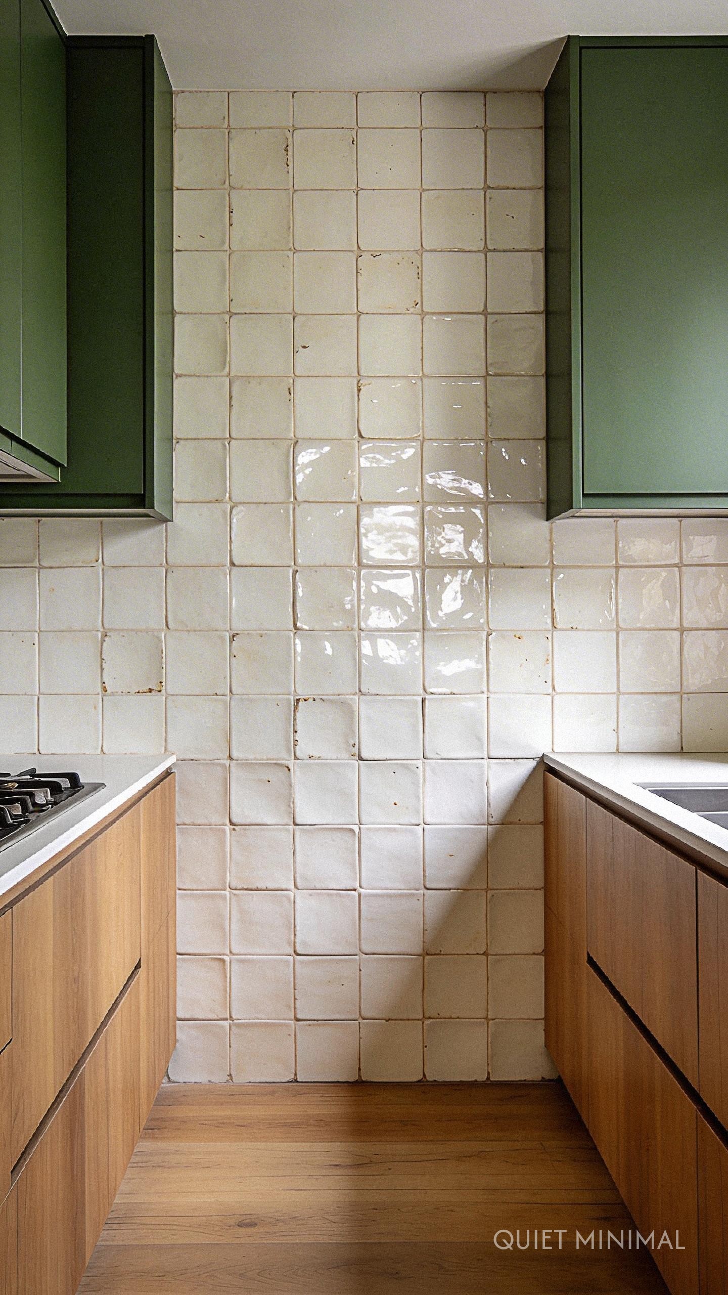Key Takeaway: Choose a backsplash with subtle texture, like zellige or handmade tiles, to add depth and reflect light without overwhelming the green and oak palette.