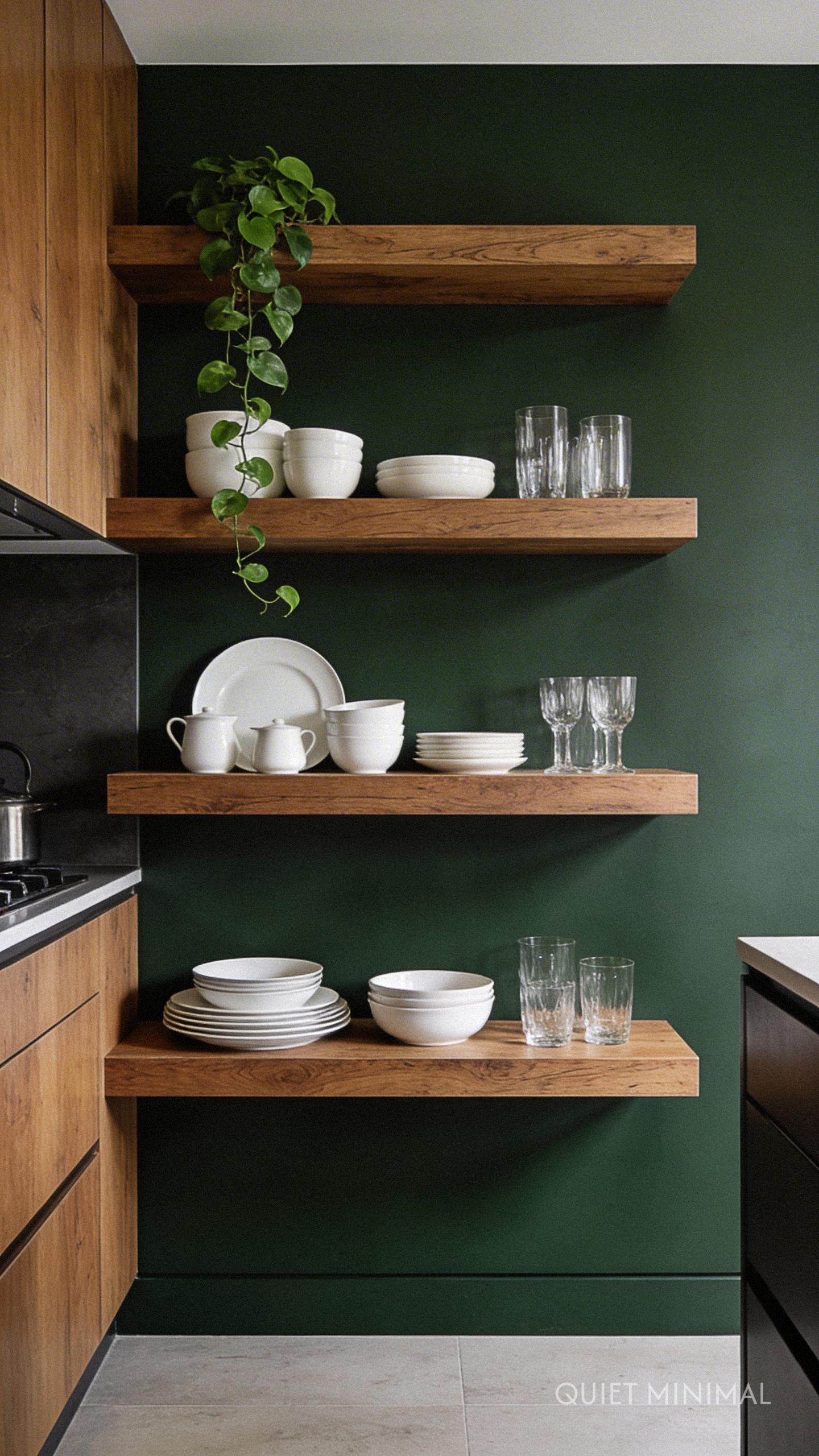 For a touch of curated personality and a break from solid cabinetry, incorporate open shelving made from natural oak. This is a perfect way to introduce the wood element without committing to a full set of oak cabinets. Use them to display your favorite handmade ceramics, glassware, and small plants. Floating oak shelves against a deep green wall create a stunning visual contrast, turning everyday items into a functional art installation. It’s an accessible update that instantly adds a layer of curated, lived-in style.