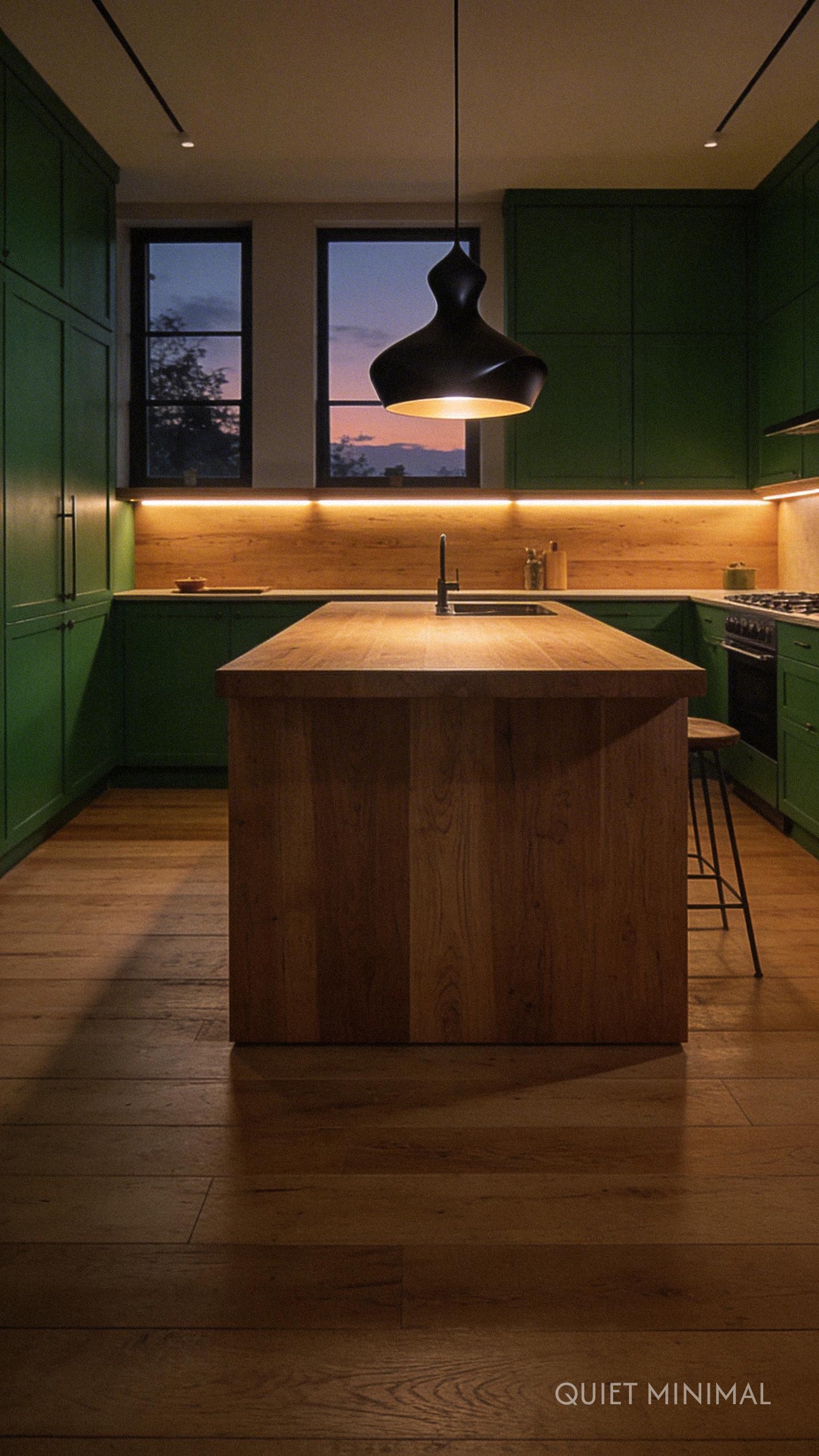 Key Takeaway: Use a layered lighting approach—ambient, task, and accent—to highlight the rich green tones and warm oak grain, creating a welcoming and functional atmosphere.