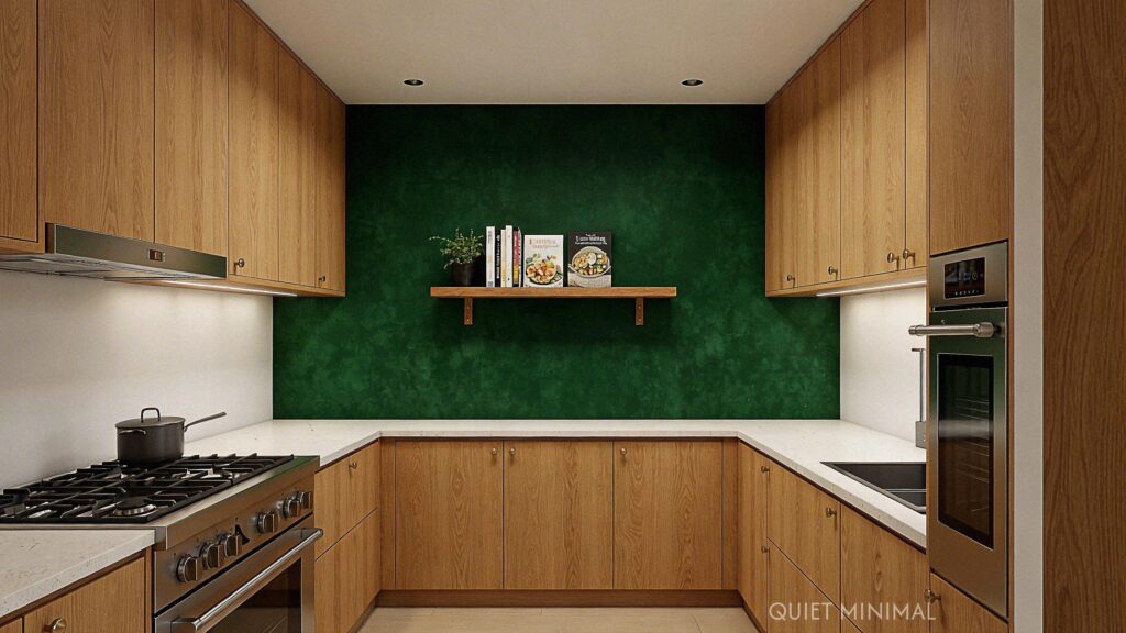 Key Takeaway: For a less permanent but equally impactful look, paint a feature wall in a deep green to serve as a dramatic backdrop for natural oak cabinets or shelves.