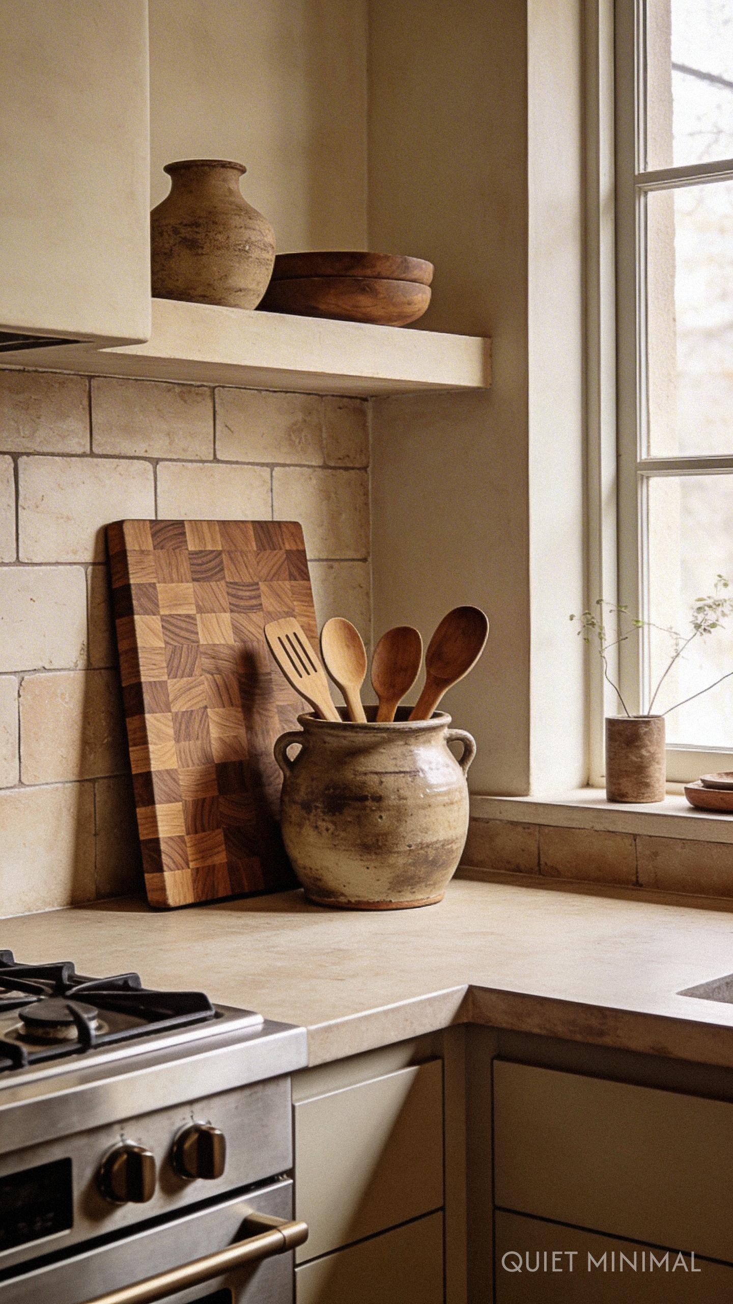 Even a tidy kitchen has items that live on the counter. The key is to make them feel like part of the decor. Ditch the plastic utensil holder and mismatched salt shaker for cohesive pieces made from earthy materials. A heavy ceramic crock for wooden spoons, a small marble pinch bowl for salt, and a thick wooden cutting board leaning against the backsplash all contribute to the aesthetic. When your functional items are beautiful and made from materials like stone, wood, and ceramic, they cease to be clutter. They become a curated collection that enhances the warm, layered feel of your space.