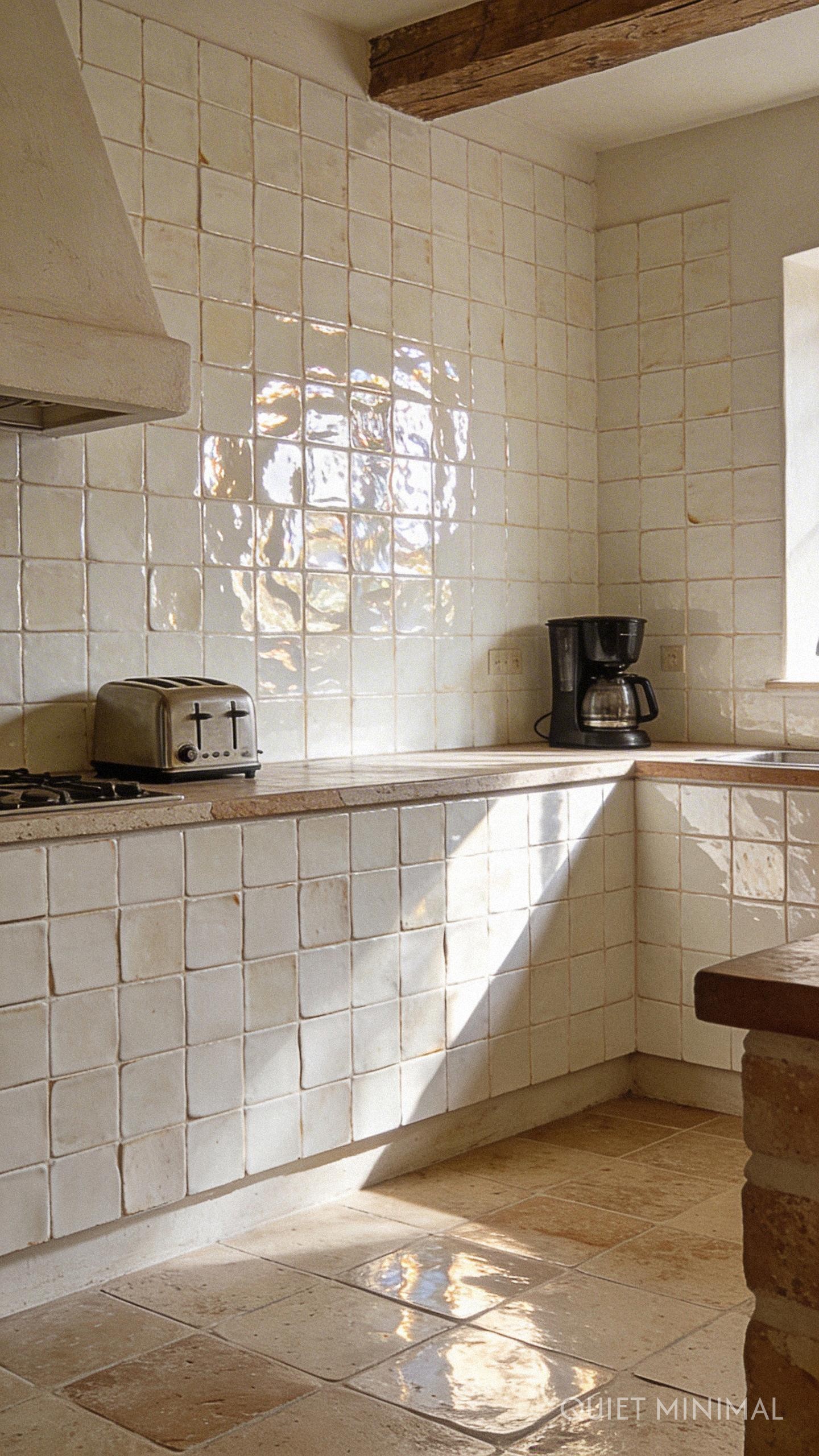 Key Takeaway: Select a backsplash with texture and organic variation, like zellige or stone, to create a focal point that naturally masks everyday splashes and countertop clutter.