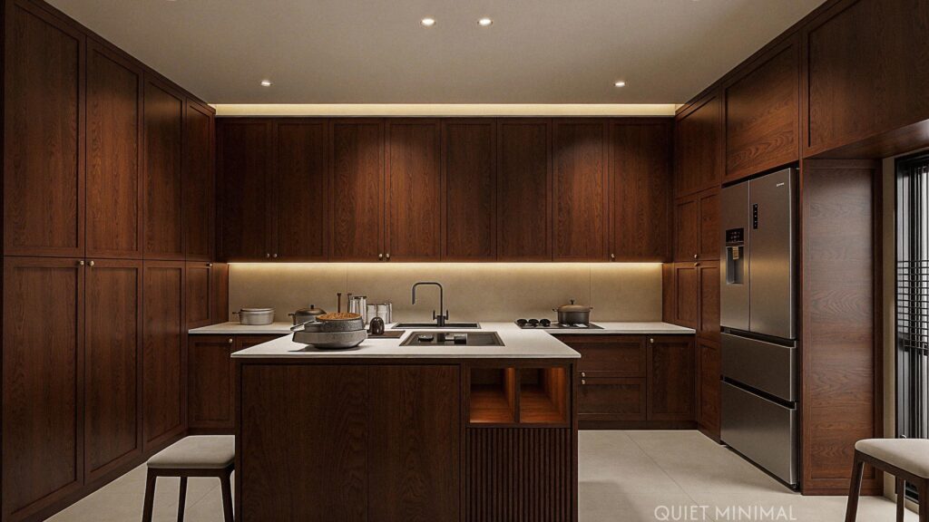 Key Takeaway: Use custom cabinet panels on your dishwasher and refrigerator to make them disappear, creating a seamless, high-end look that minimizes visual clutter.