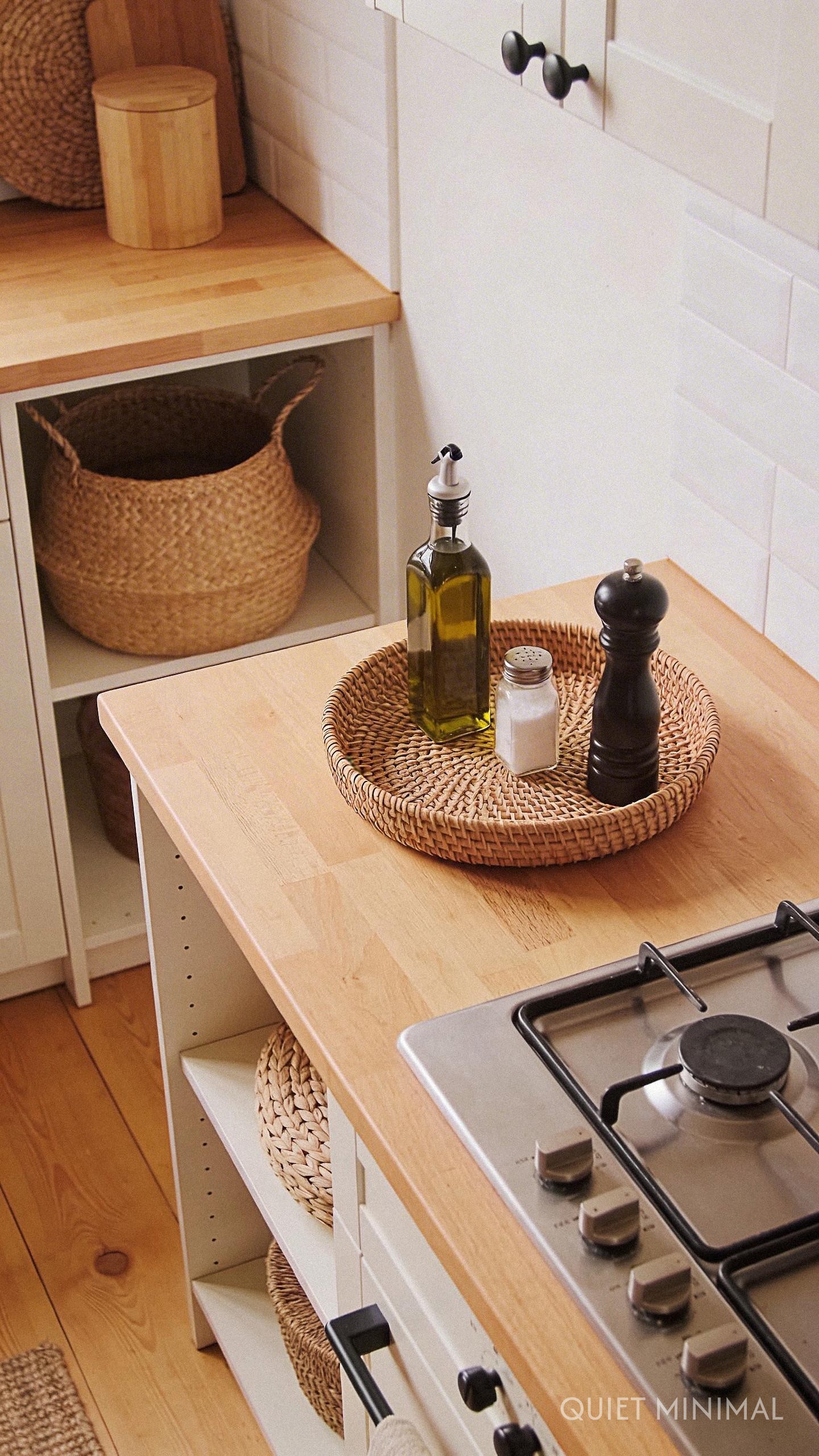 Key Takeaway: Use woven baskets and natural fiber bins to intentionally contain countertop clutter, transforming messy spots into stylish, textured vignettes.