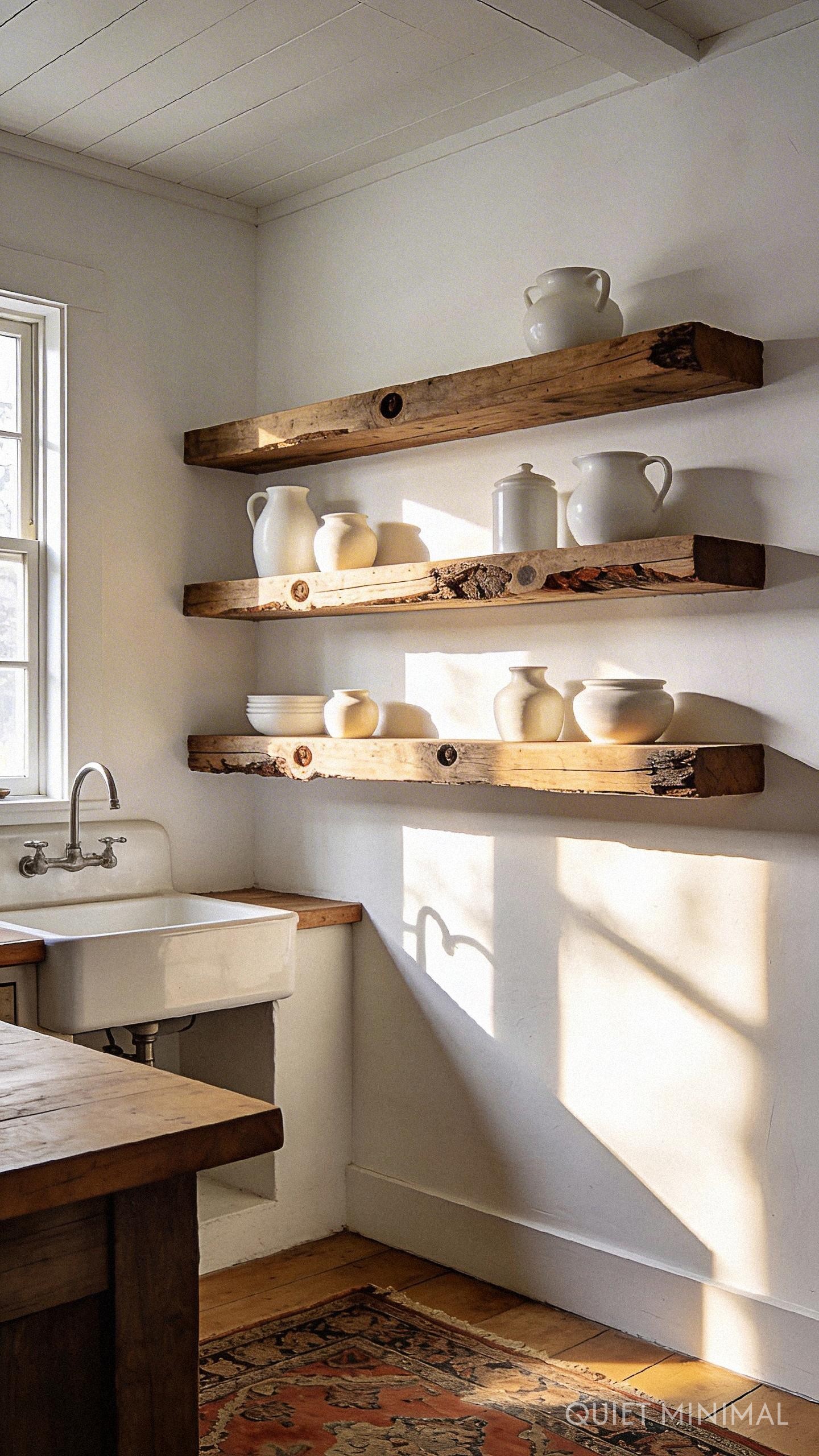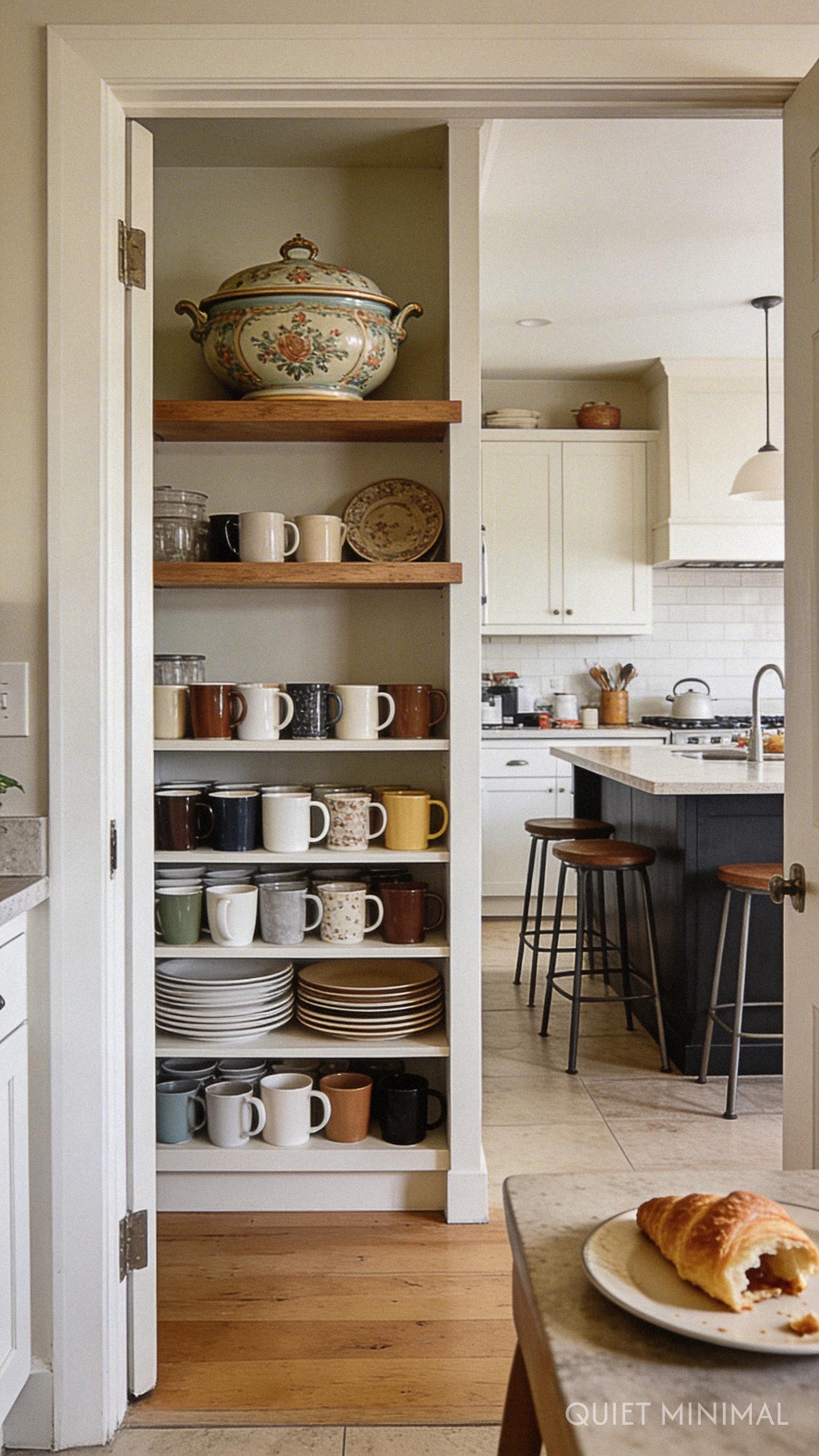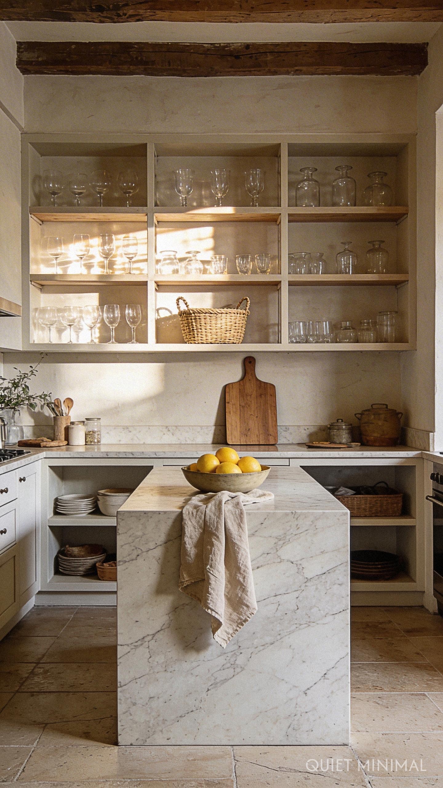 Open shelving can quickly veer from “charming” to “chaotic” if colors aren’t managed intentionally. To maintain that serene, Quiet Minimal vibe, focus on a cohesive color palette for the items you display. A collection of cream, white, and oatmeal-toned stoneware looks stunning against warm wood shelves.