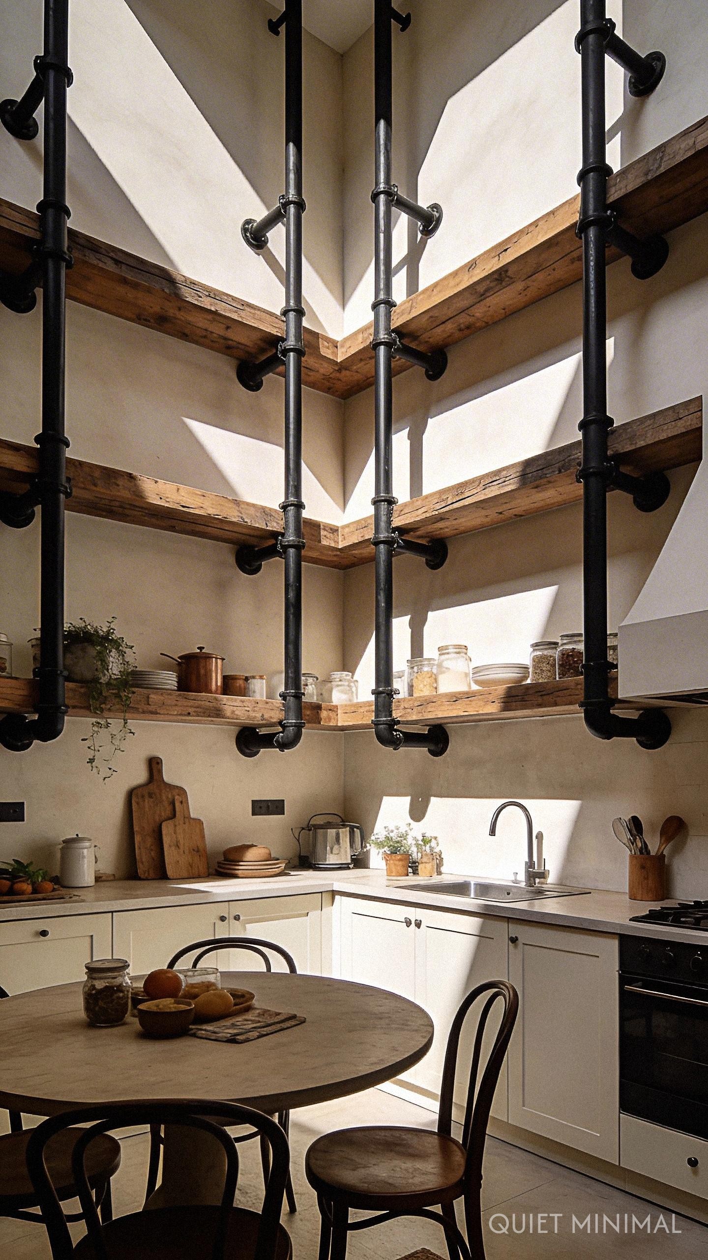 Warmth doesn’t always mean soft. Sometimes, warmth comes from the dynamic tension between materials. Pairing raw wood shelves with matte black iron brackets or industrial piping creates a sophisticated visual anchor. This hardware acts as the “eyeliner” of the room—defining the lines and adding a graphic element that keeps the farmhouse vibe from feeling too antique or dated.