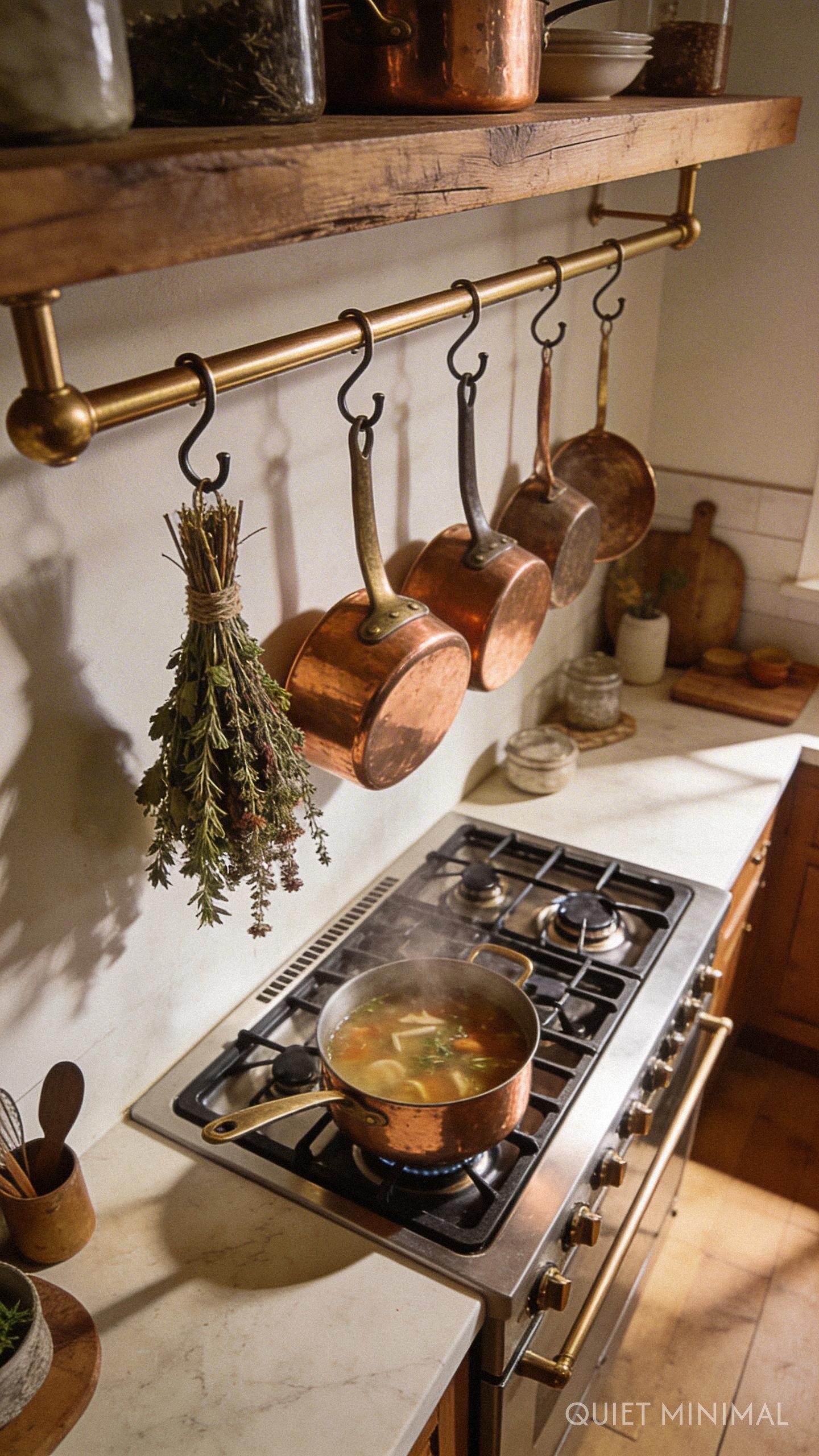 Don’t stop designing at the shelf’s edge. The space immediately below the bottom shelf is prime real estate for adding warmth and utility. Installing a simple brass rail with S-hooks allows you to hang copper pots, drying herbs, or your favorite linen tea towels.