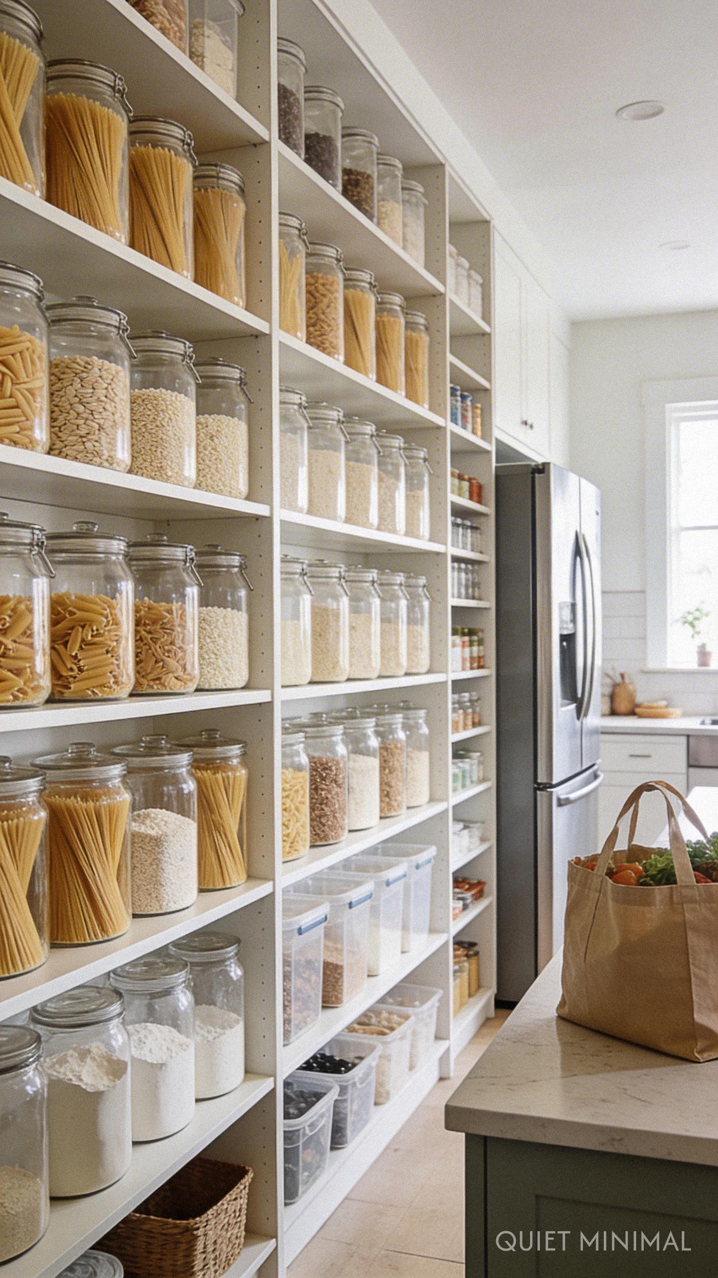 Nothing ruins the aesthetic of an open shelf faster than a cardboard cereal box. Embrace the “zero-waste” lifestyle aesthetic by decanting dry goods into large glass jars. Pasta, rice, flour, and coffee beans become decor when stored in uniform glass containers.