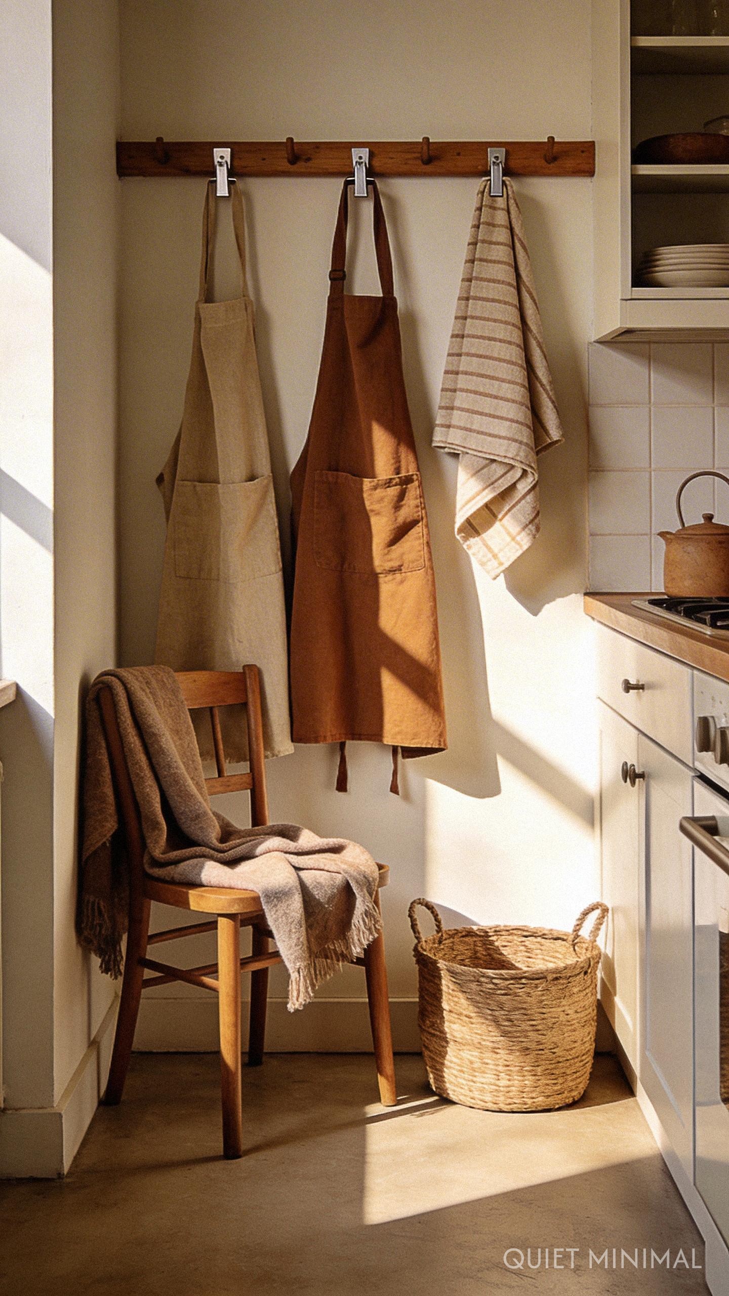 Textiles add softness to the hard surfaces of a kitchen. Using a rail system with clipped hooks or small hanging baskets allows you to store tea towels, cloth napkins, and aprons on the wall.