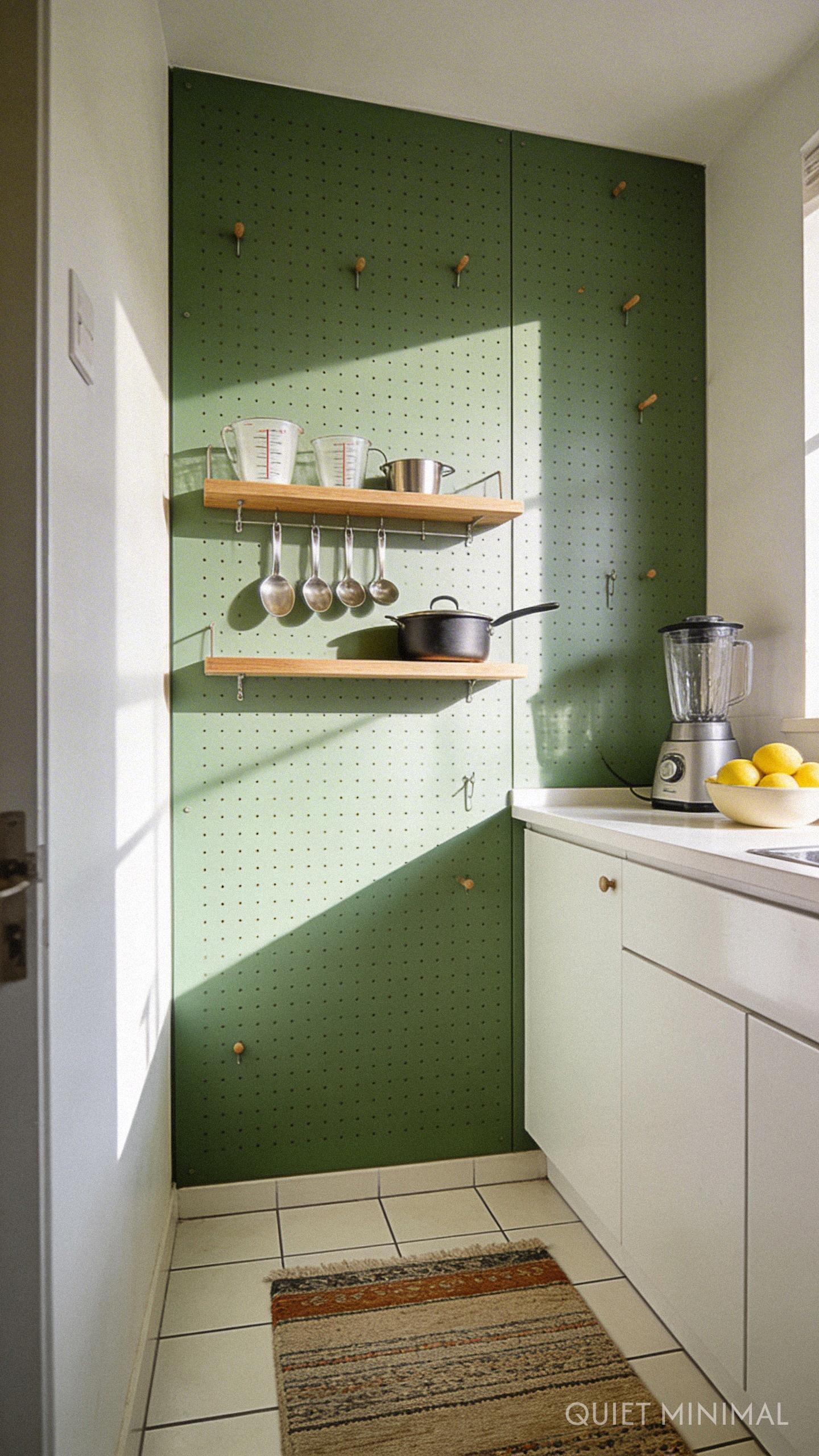 Channel your inner maker with a solution that is as versatile as it is trendy. A pegboard isn’t just for the garage anymore; in a modern kitchen, it acts as a dynamic, customizable storage system. By painting a wooden pegboard in a monochromatic tone that matches your walls or a soft accent color (think sage green or terracotta), you create a seamless look that doesn’t feel cluttered.