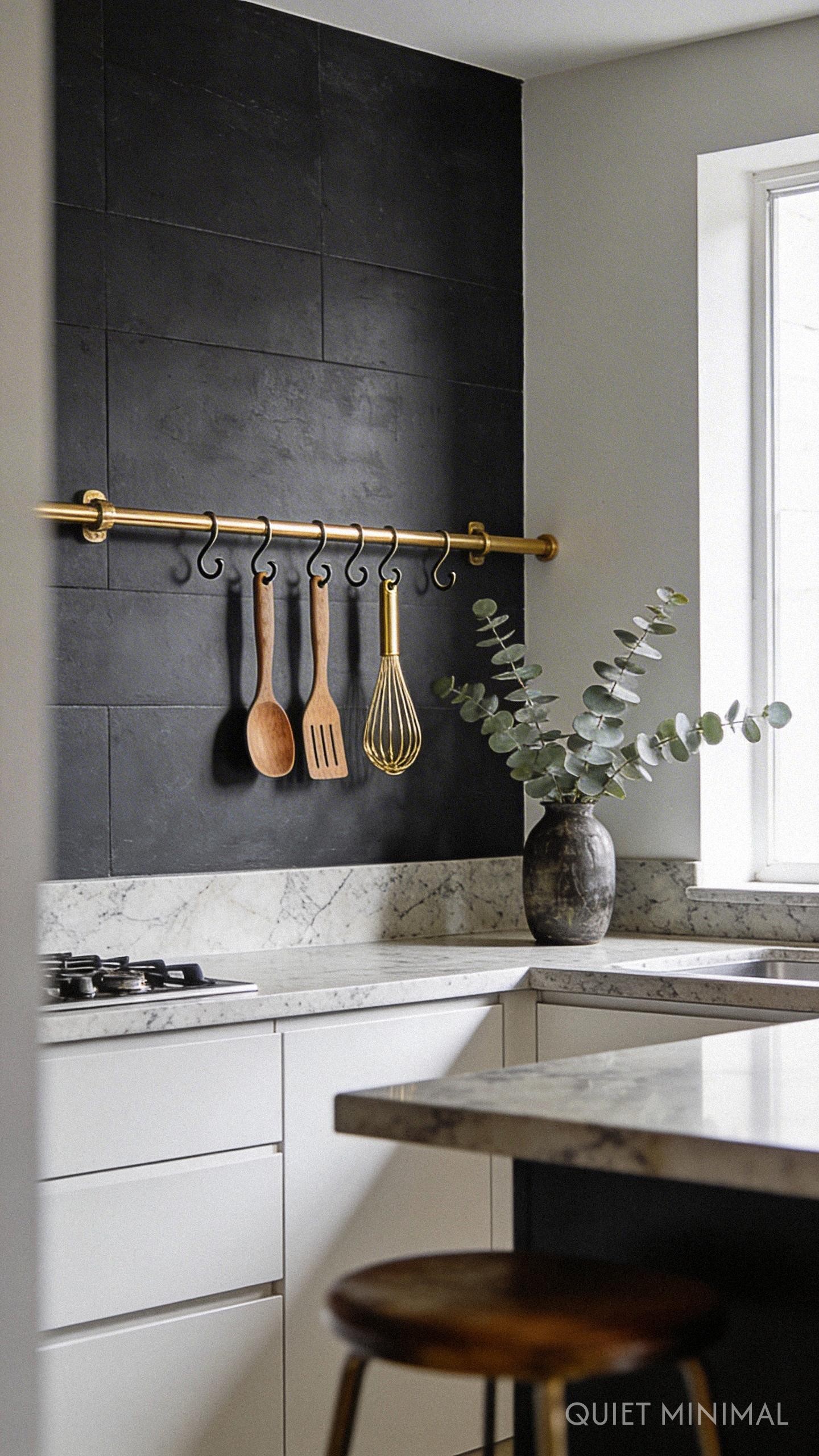 This approach treats your utensils as decor. When selecting your tools, opt for cohesive materials—wood, stainless steel, or gold finishes—so the display looks intentional rather than chaotic. It adds a layer of metallic texture that breaks up the cabinetry.
