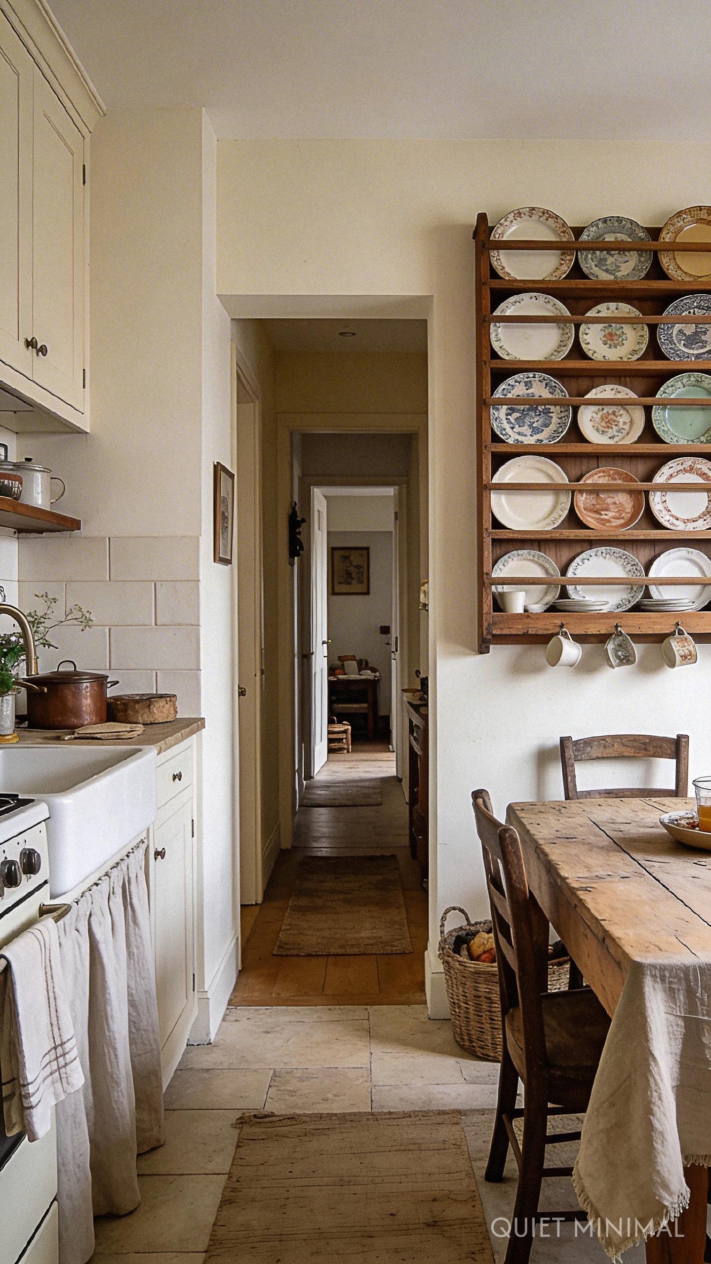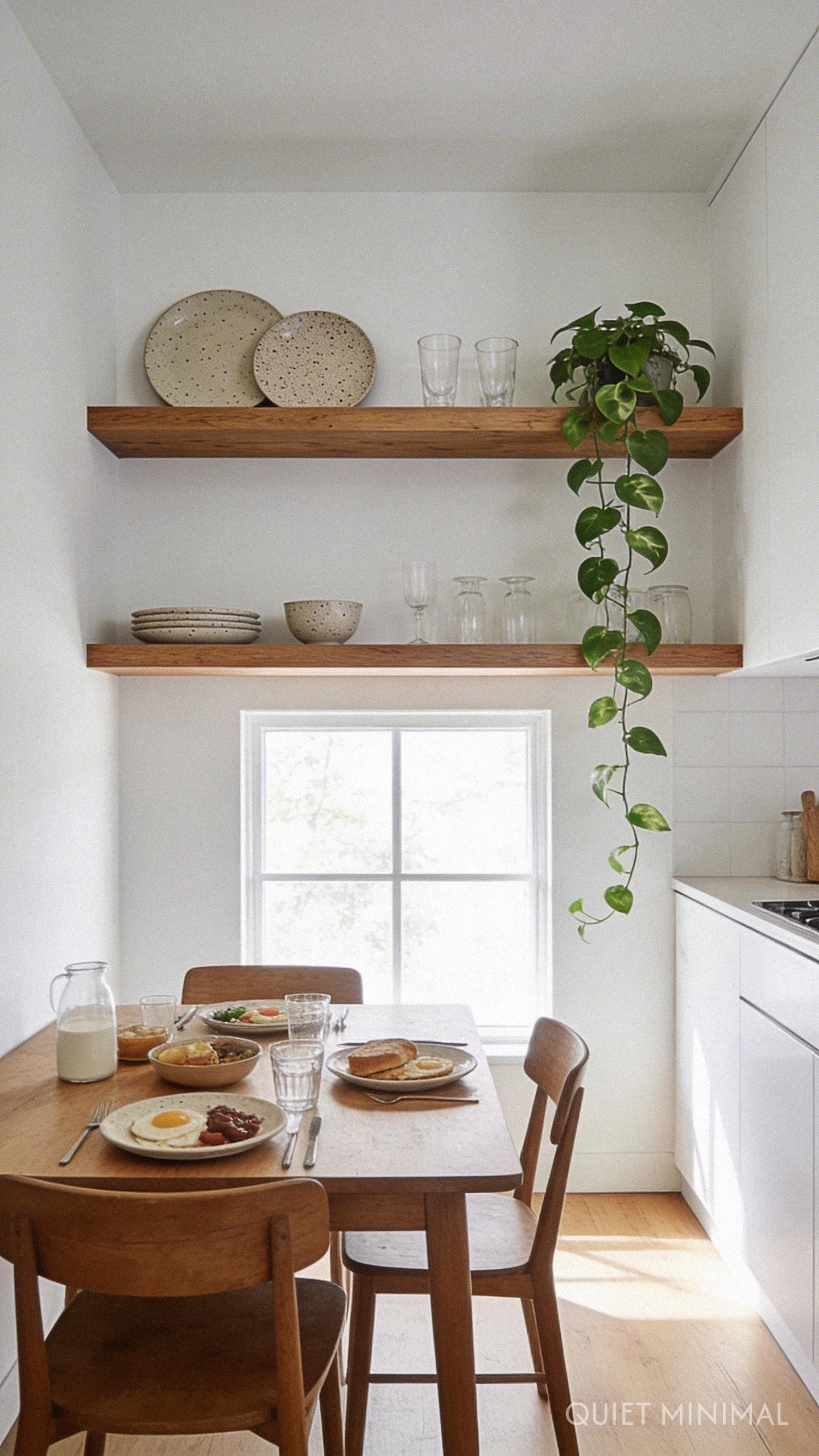 If you are struggling with limited cabinet space, floating shelves are the quintessential “Quiet Minimal” solution. However, the trick is not to overload them. Treat these shelves as a gallery for your favorite ceramics, stoneware, and glassware.