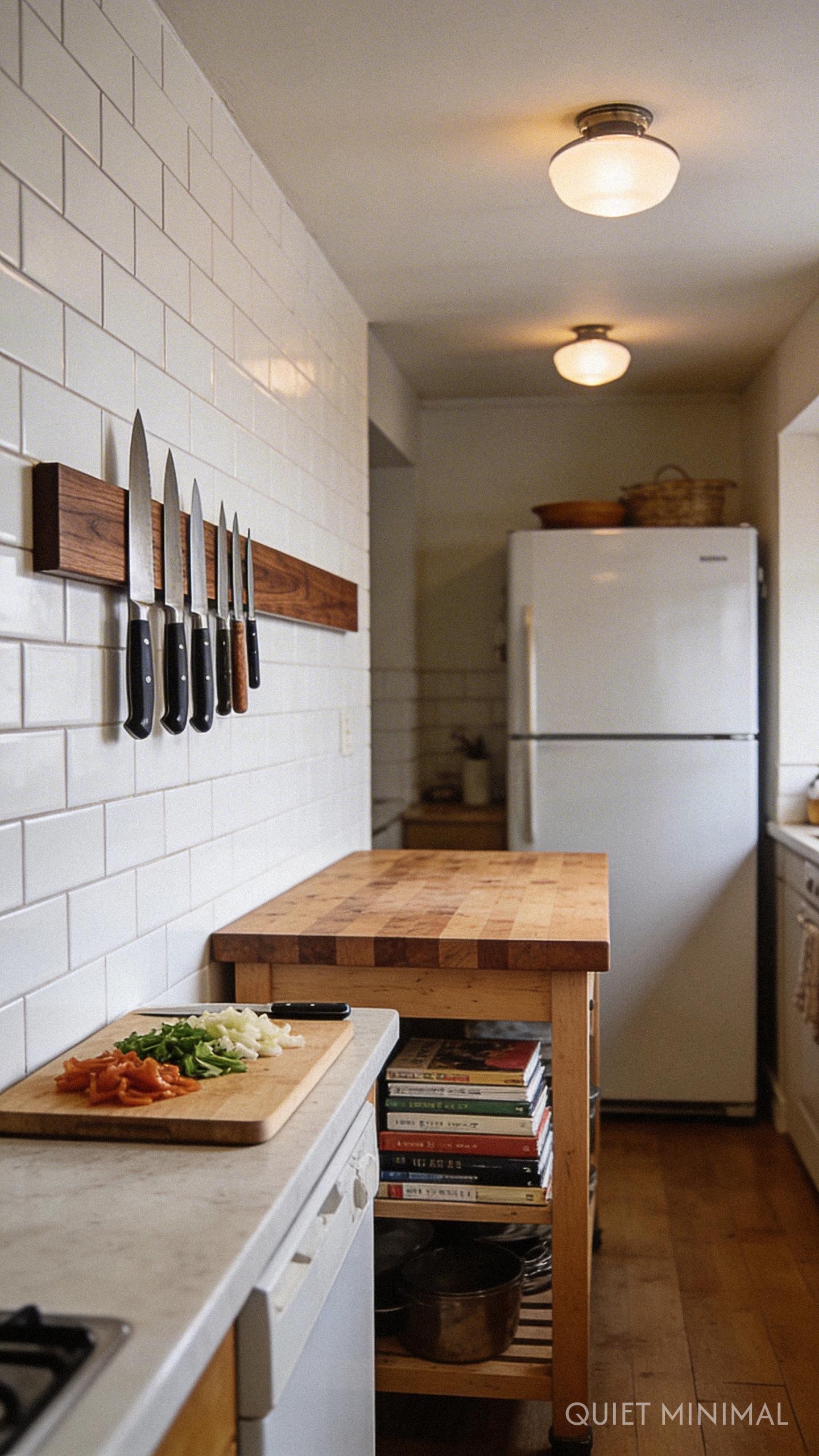A bulky wooden knife block is one of the biggest offenders when it comes to stealing counter real estate. Swap it out for a powerful magnetic strip mounted on the wall. This is a favorite among professional chefs for its efficiency, but for the design-conscious, it’s also a way to display the silhouette of your blades.