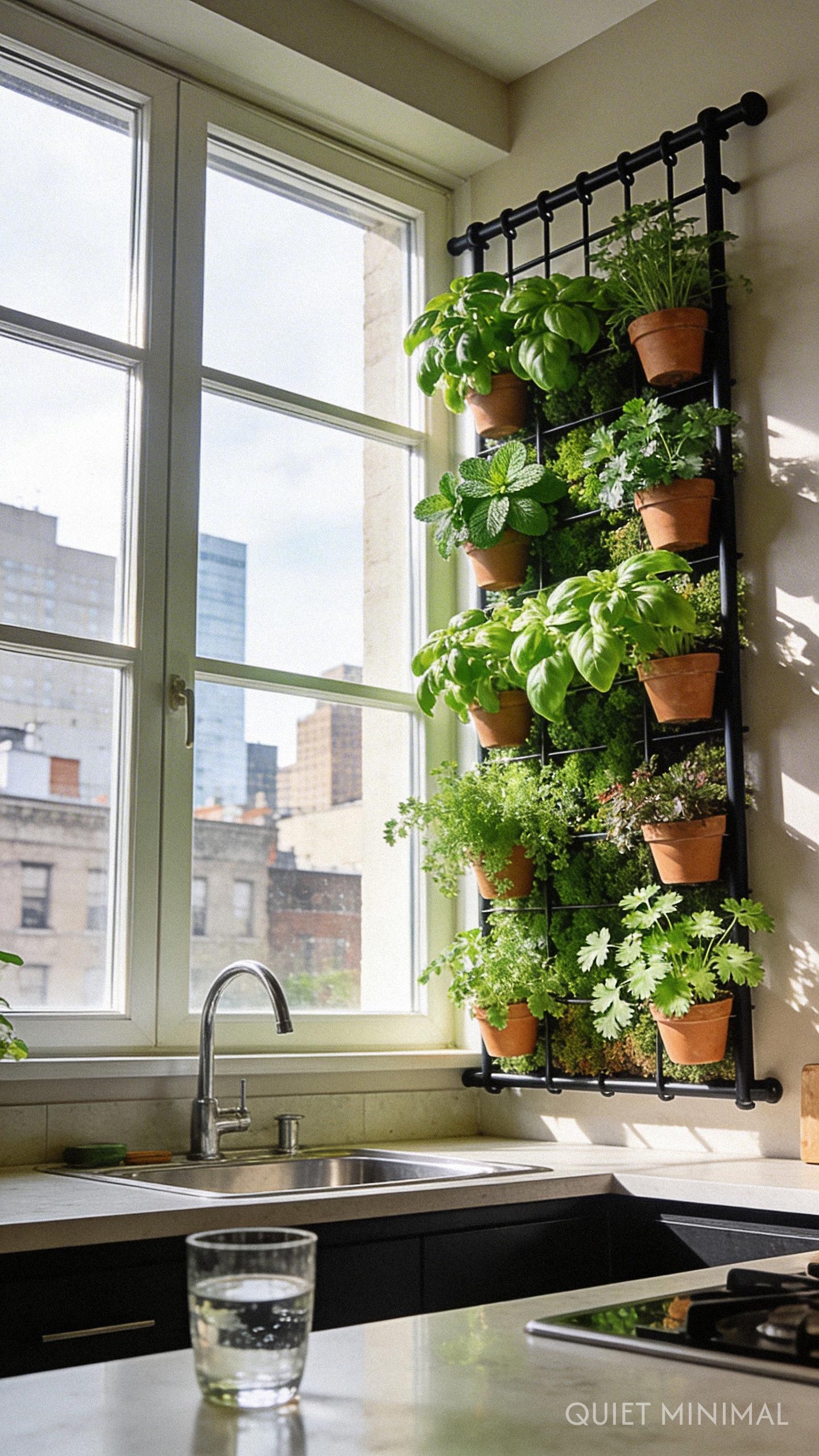 For those of us who prioritize wellness and fresh ingredients, a lack of counter space shouldn’t mean sacrificing fresh herbs. Utilizing wall-mounted planters or a vertical rail system for small pots brings life into the kitchen.