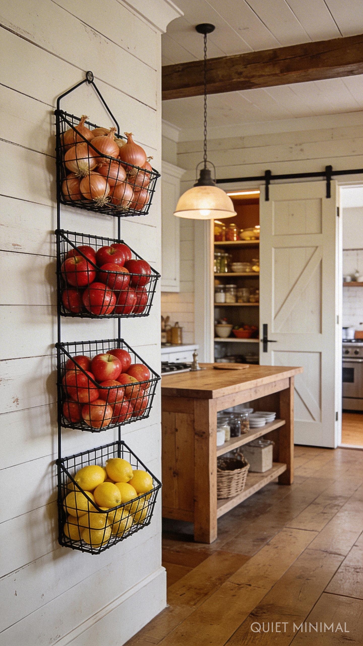This storage method promotes airflow, keeping produce fresh longer, and introduces natural textures to your wall. Grouping three baskets vertically creates a structured, organized look that draws the eye upward, making the ceiling feel higher.