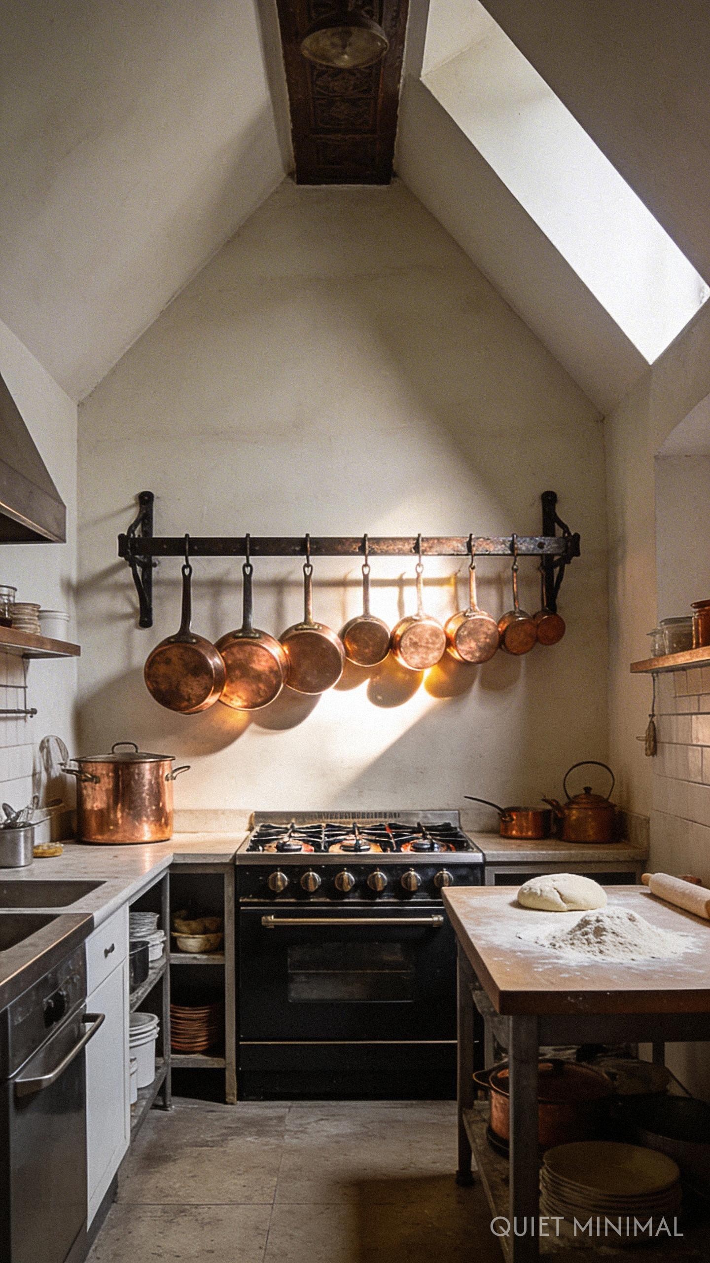 To keep the look refined, try to stick to one type of cookware on the rack—such as all copper, all stainless steel, or all cast iron. The uniformity turns a pile of cookware into a cohesive design feature.