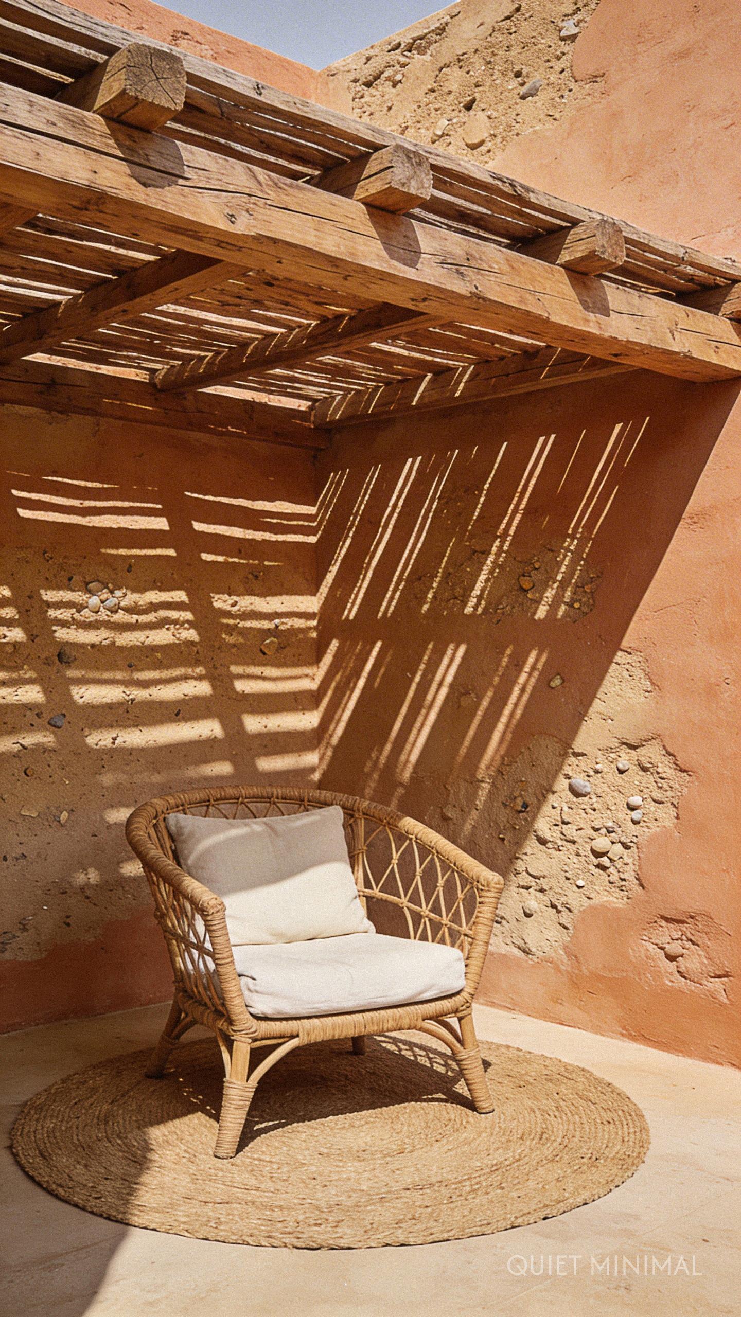 Key Takeaway: Combine smooth, chalky walls with rough wood and woven materials to create a tactile experience that feels layered and authentic.