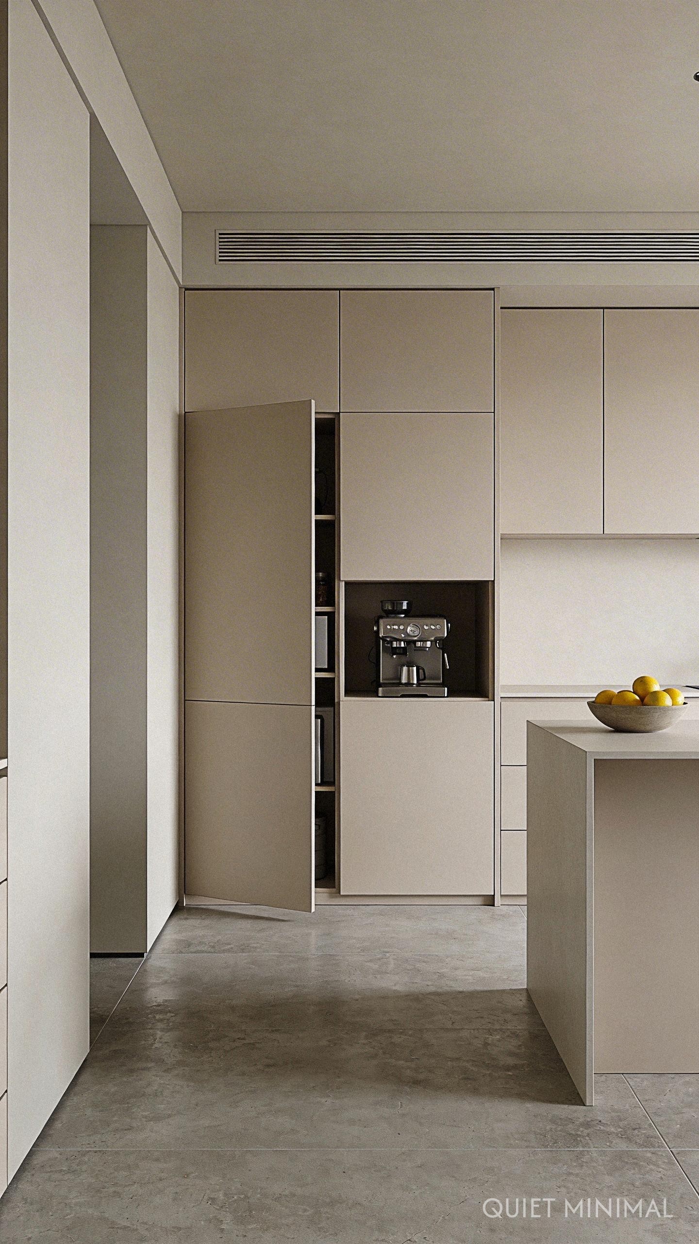 Key Takeaway: Reduce visual clutter by hiding small appliances behind cabinetry doors to maintain a seamless, furniture-like appearance.