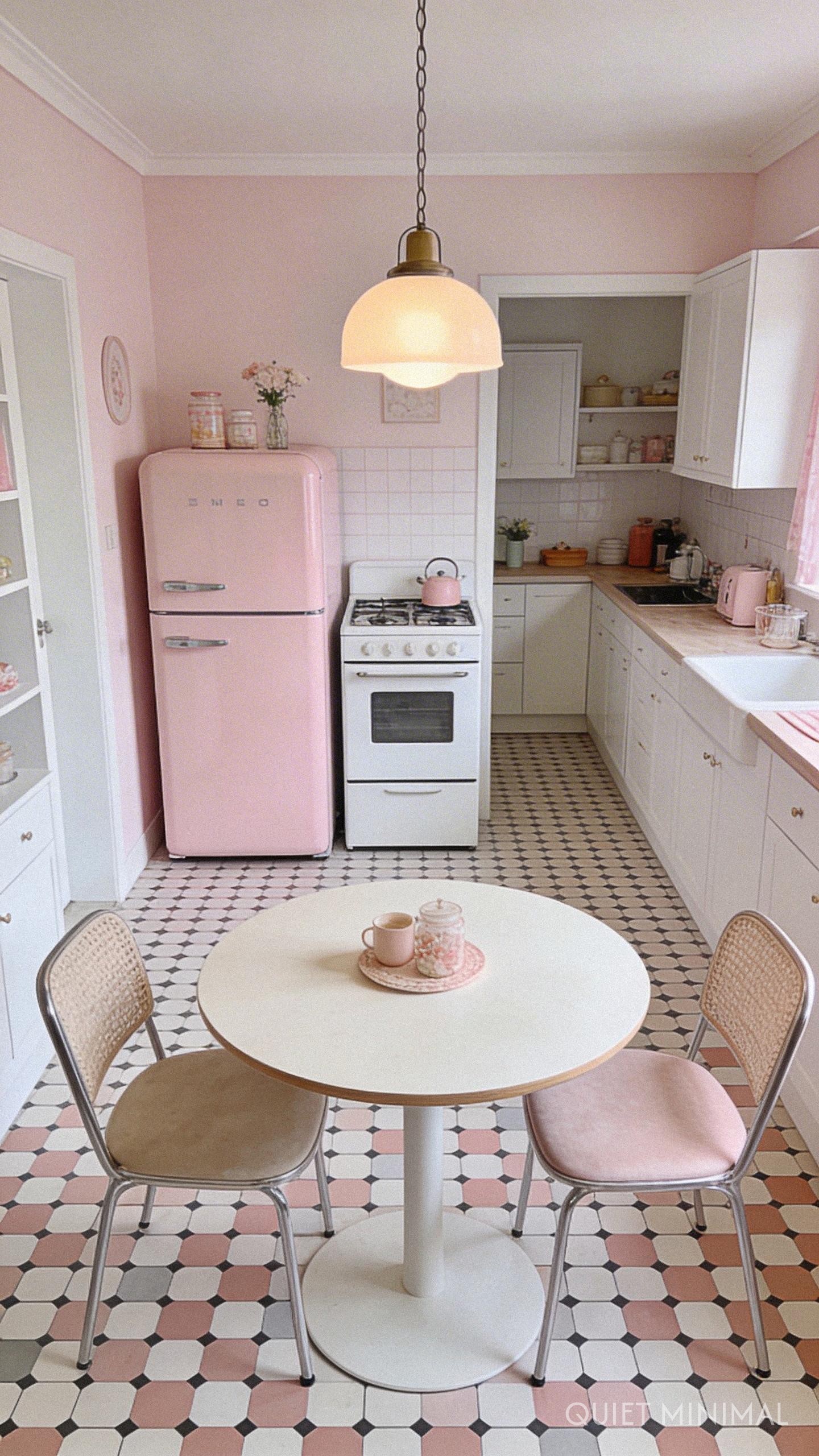Key Takeaway: If appliances must be visible, select compact, retro-styled models that contribute to the room’s overall character.
