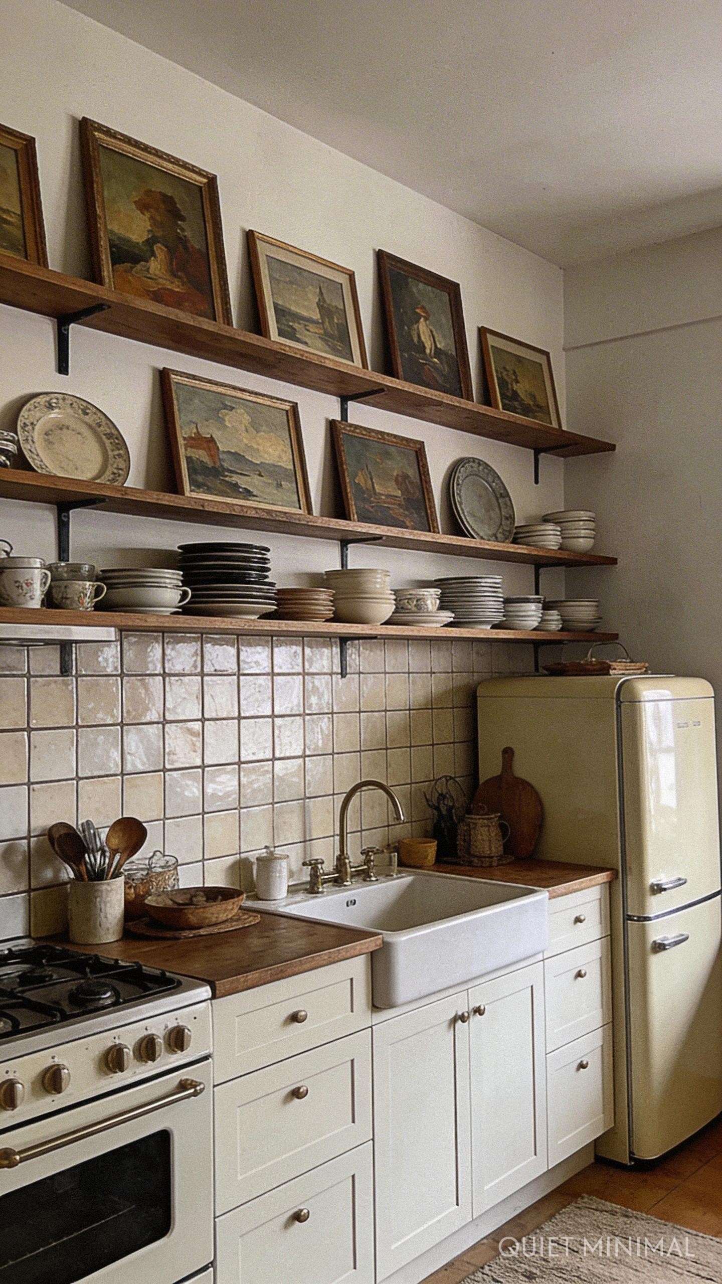 Treat your open shelves like the gallery wall behind your sofa. Don’t be afraid to lean artwork, framed prints, or vintage oil paintings against the back wall of the shelf, layered behind your dishware. This technique adds depth and personality, signaling that this space is for more than just storage—it is for inspiration. A small, thrifted landscape painting tucked behind a stack of plates introduces color and soul, softening the utilitarian vibe of a kitchen.