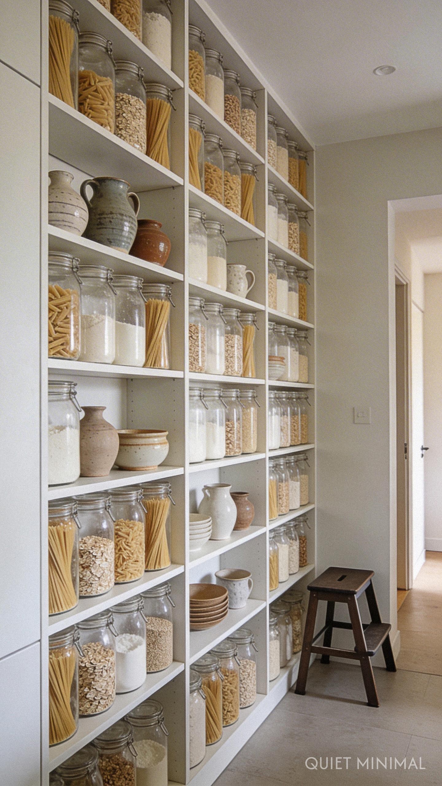 Key Takeaway: Transfer pantry staples into matching glass containers to eliminate brand clutter and elevate the visual calm of your shelves.