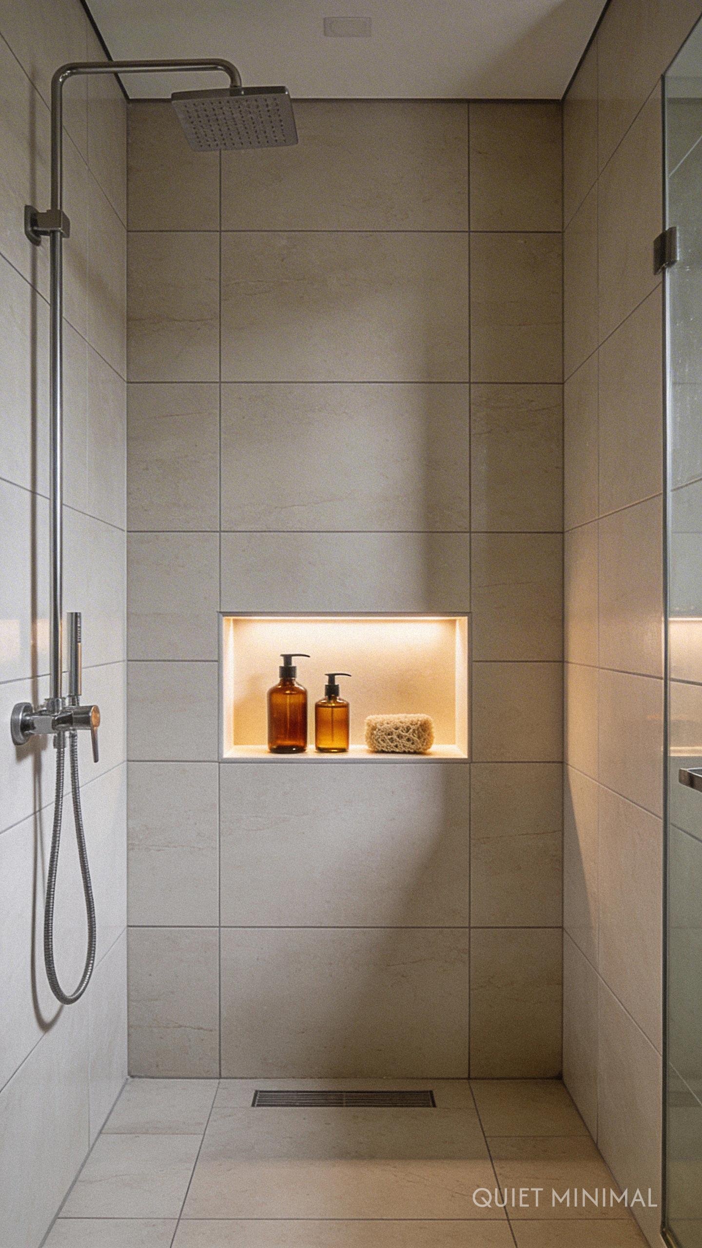 Key Takeaway: Recessed wall niches provide sophisticated, space-saving storage for everyday essentials without cluttering the bathroom’s narrow footprint.