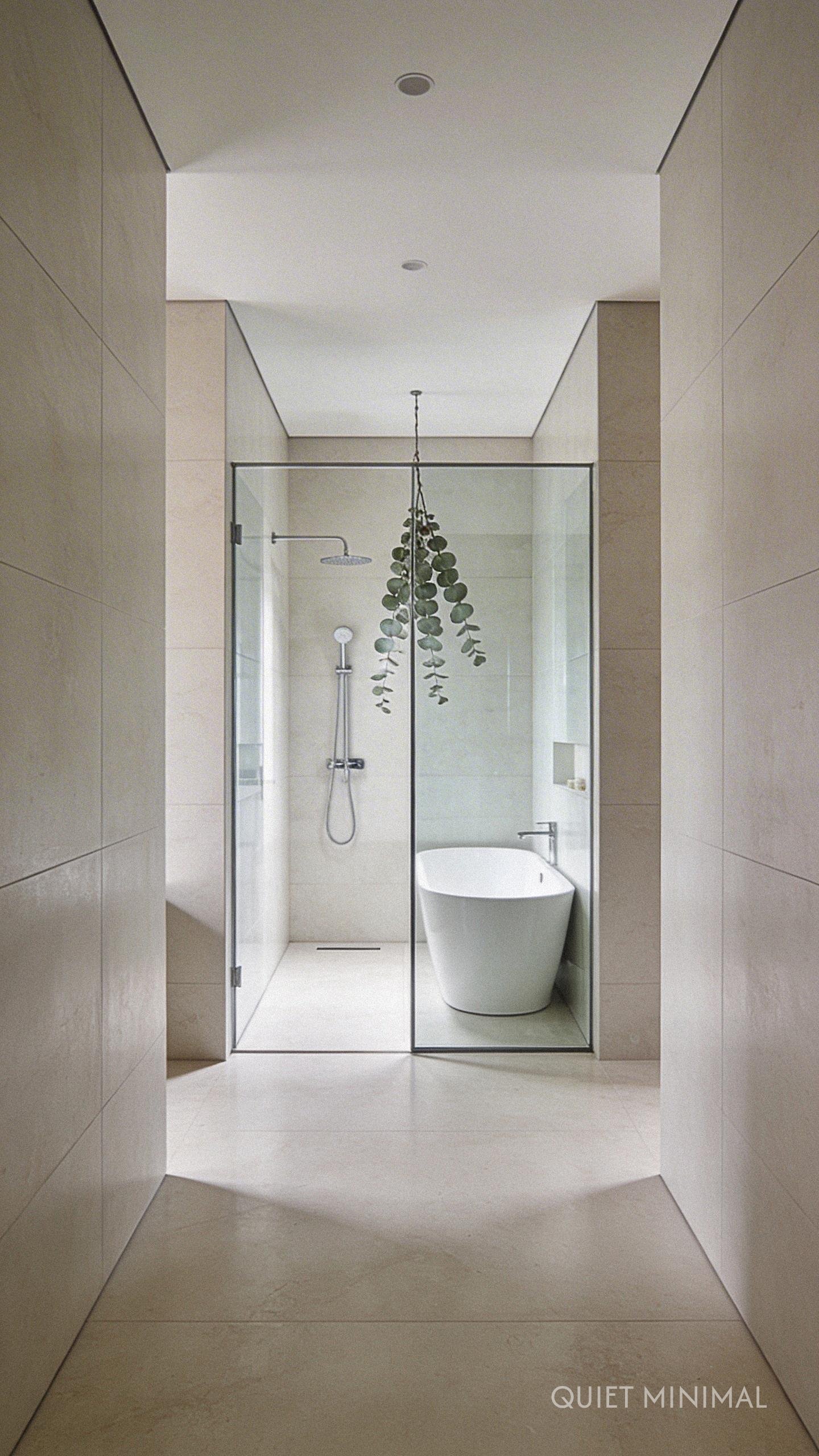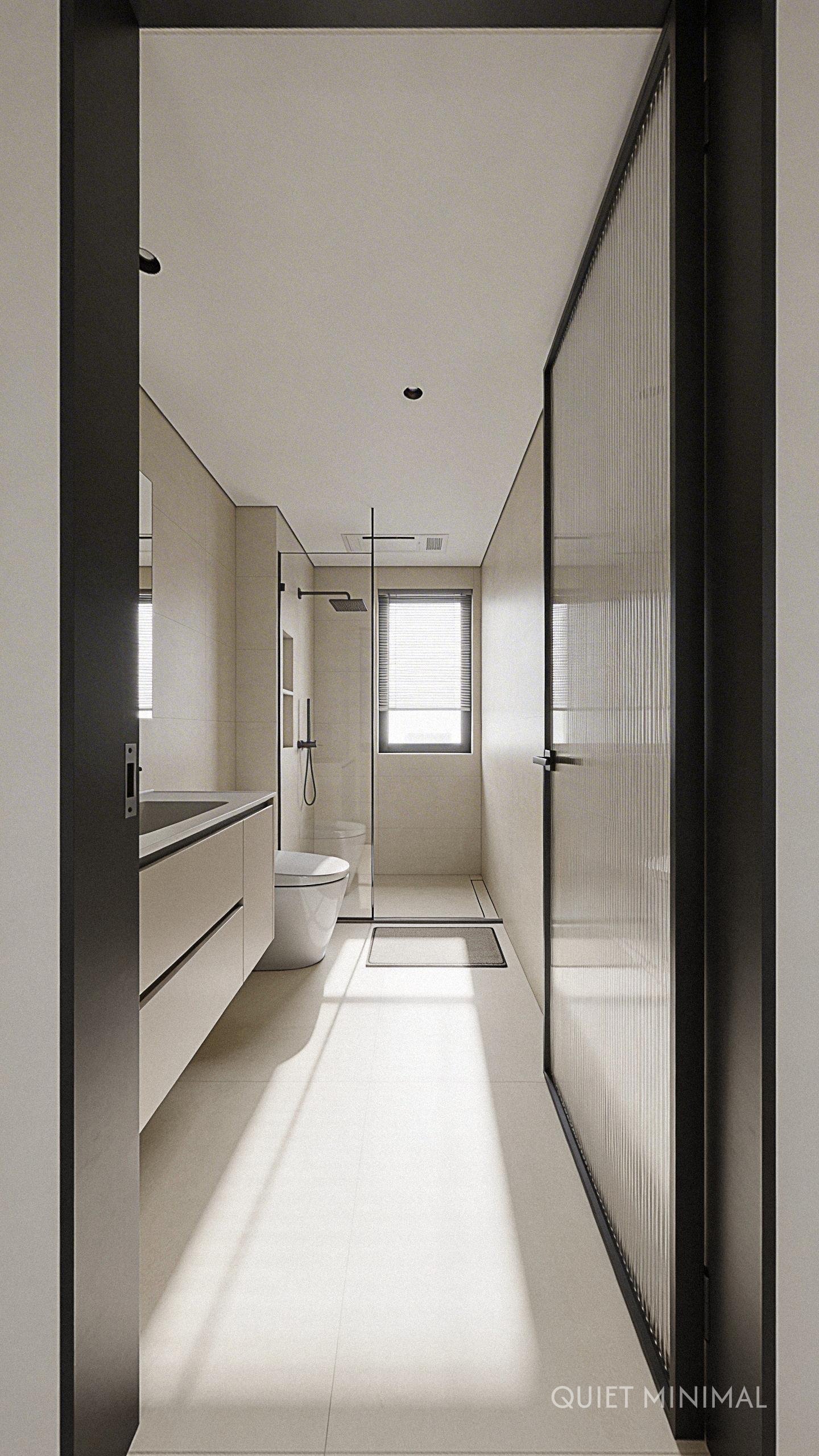Key Takeaway: Grouping the shower and bath behind a single glass partition at the end of the room creates a luxurious, efficient, and easy-to-clean wet zone.
