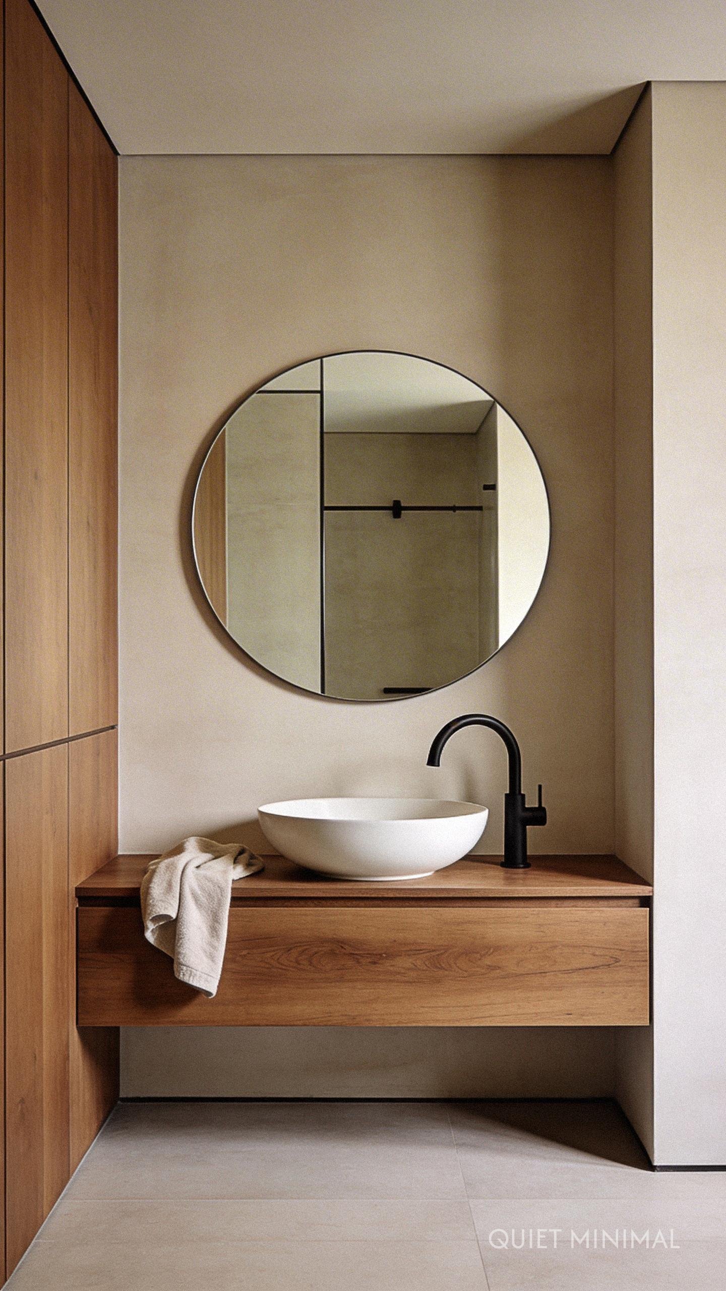 Key Takeaway: Balance the harsh geometry of a rectangular room by incorporating soft, curved elements like a round mirror, vessel sink, or arched fixtures.