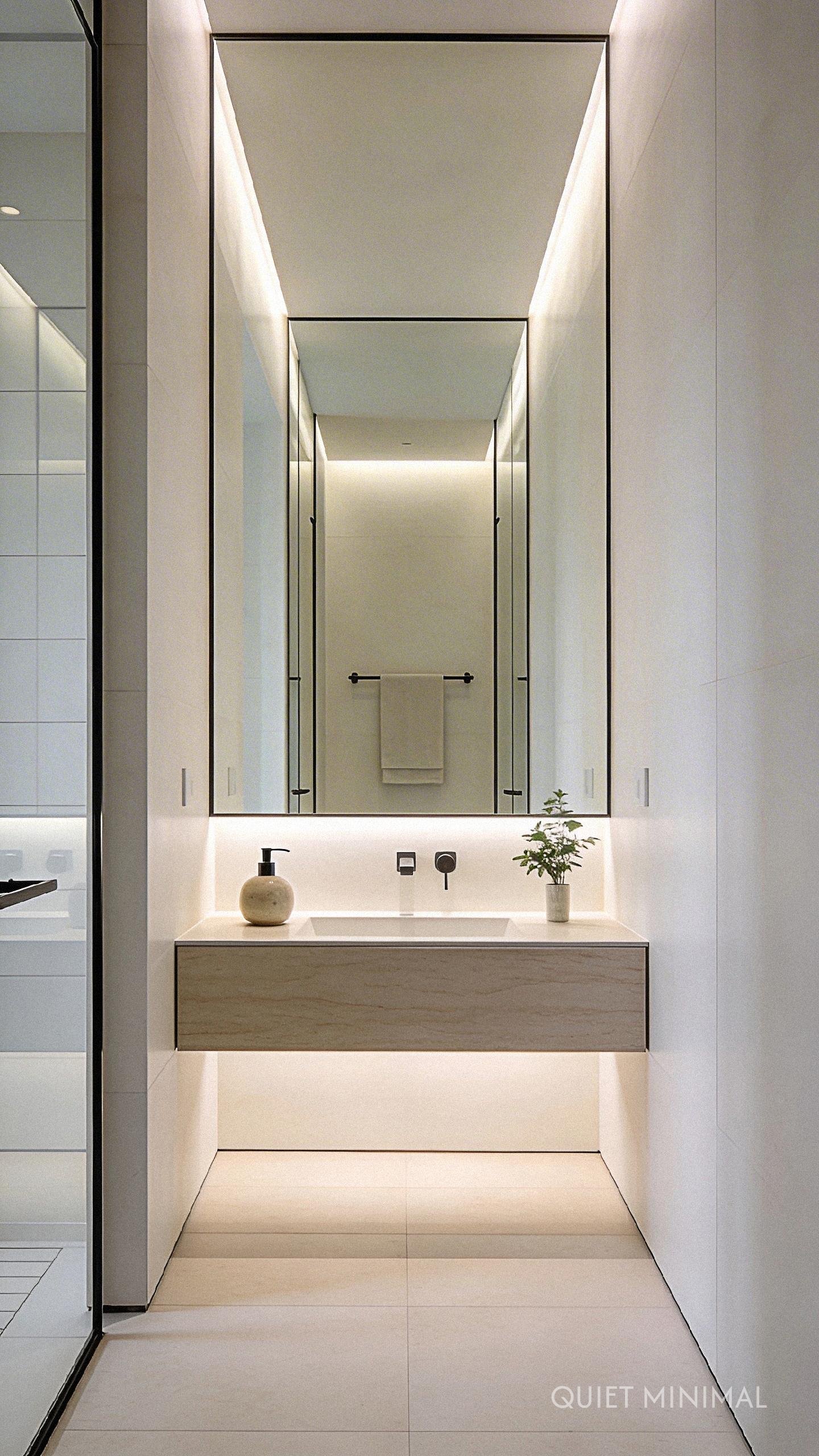 This is perhaps the most powerful optical illusion in a designer’s toolkit. Instead of a small, framed mirror above the sink, install a custom-cut mirror that stretches from wall to wall along the vanity. This instantly doubles the perceived width of the room by reflecting the entire space, bouncing light around, and erasing the visual boundary of one of the long walls.