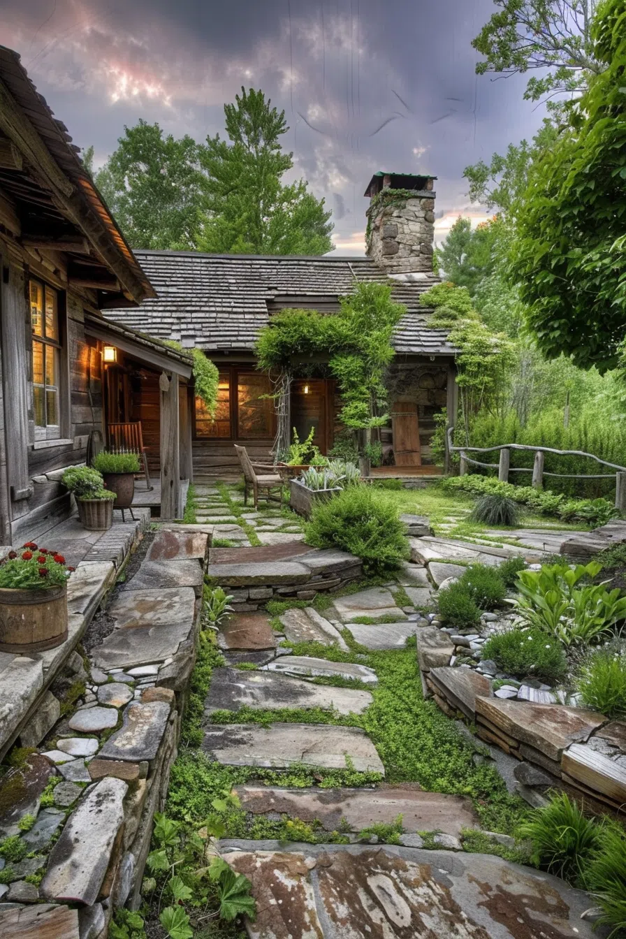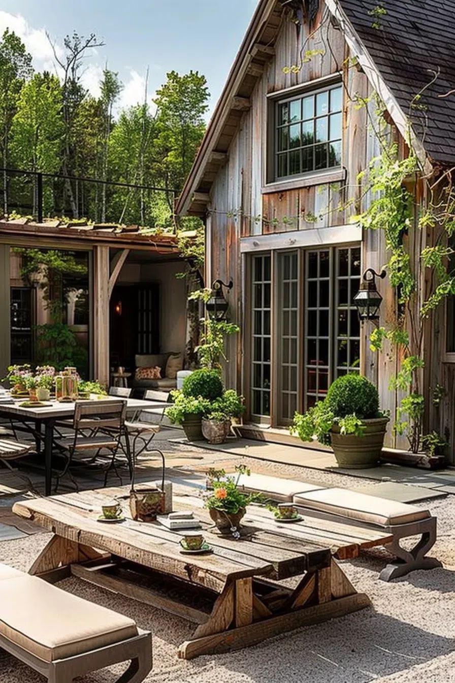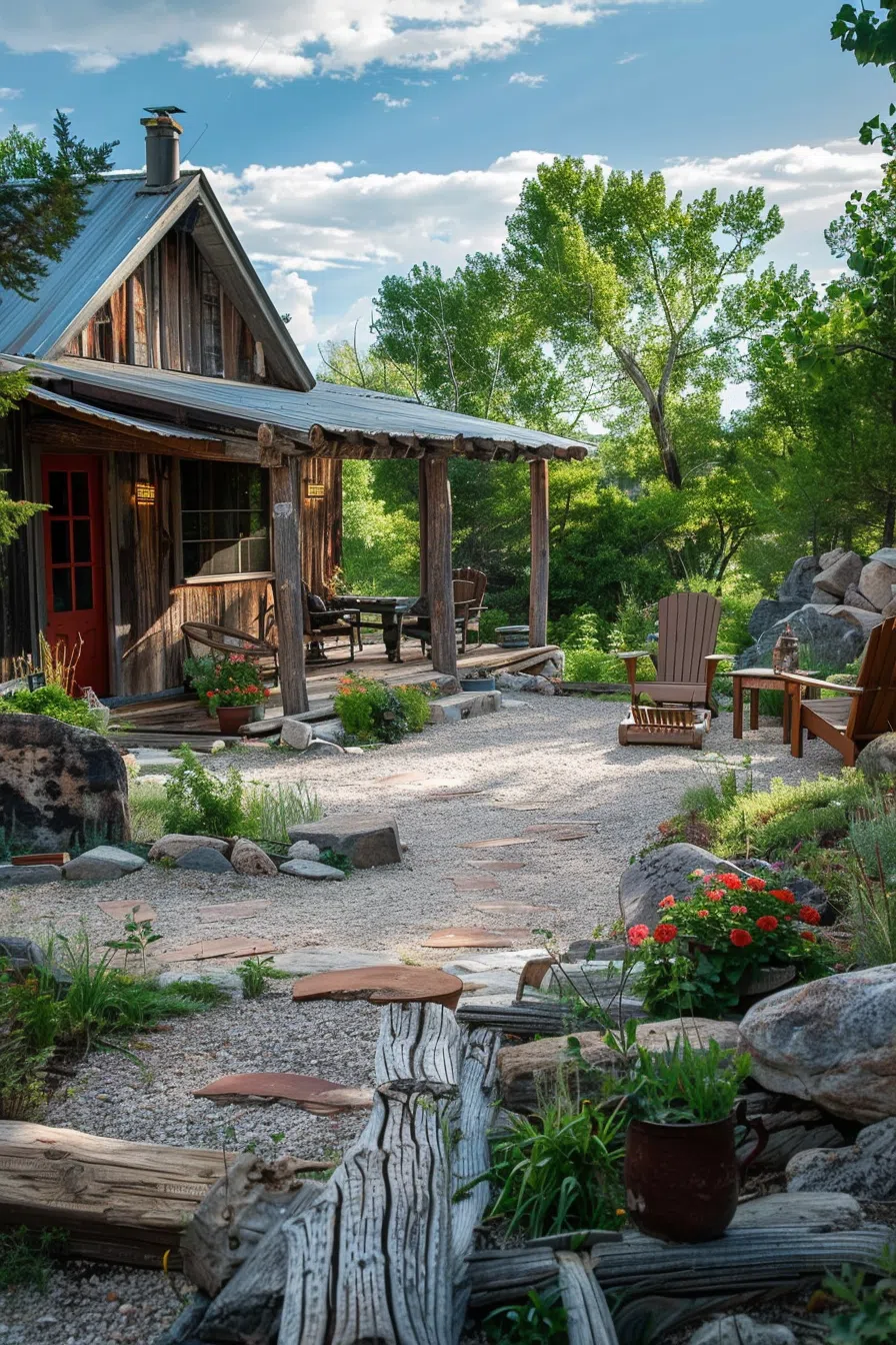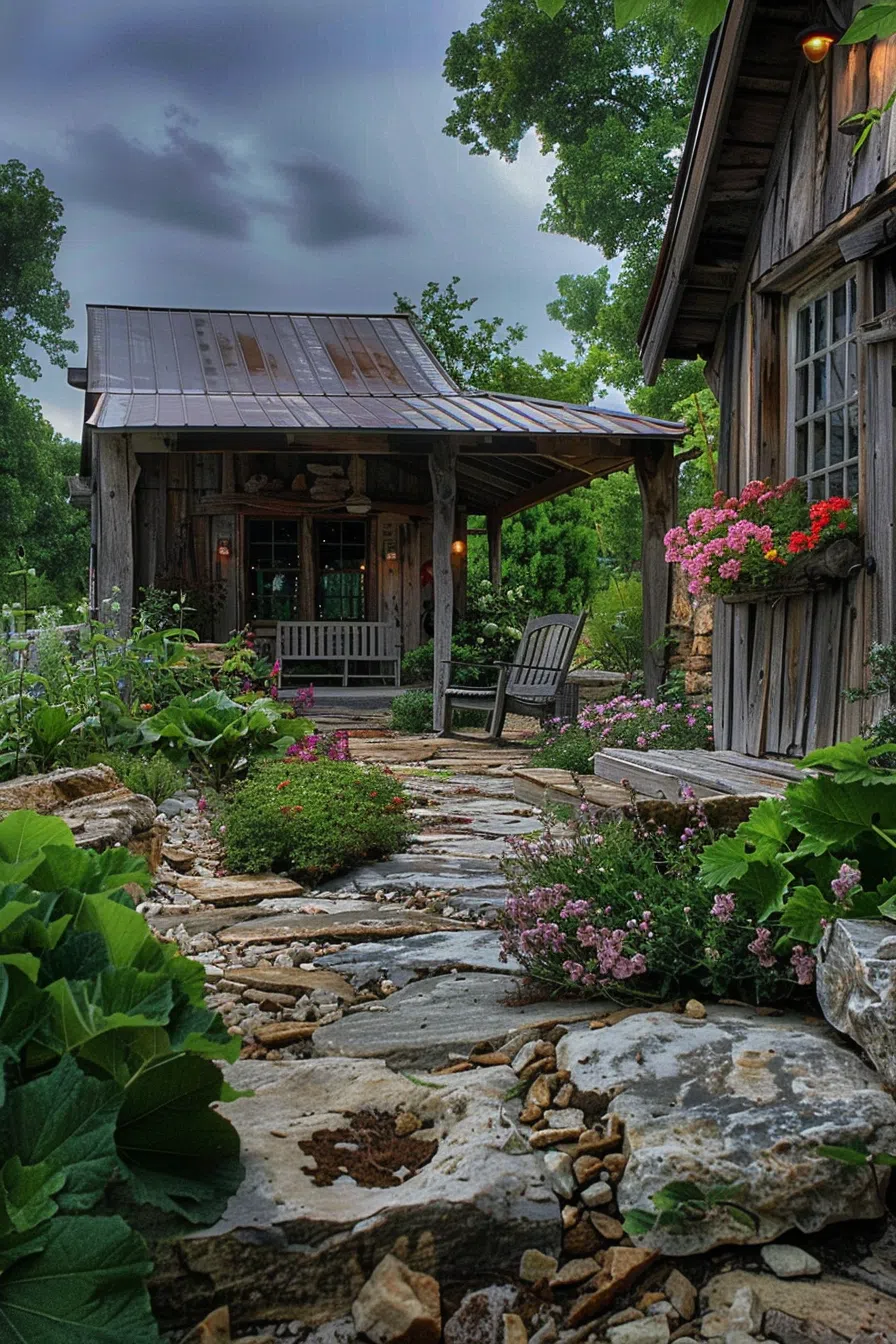 - Landscaping with rustic elements such as weathered wood benches, stone paths, reclaimed wood planters, and rusted metal accents.