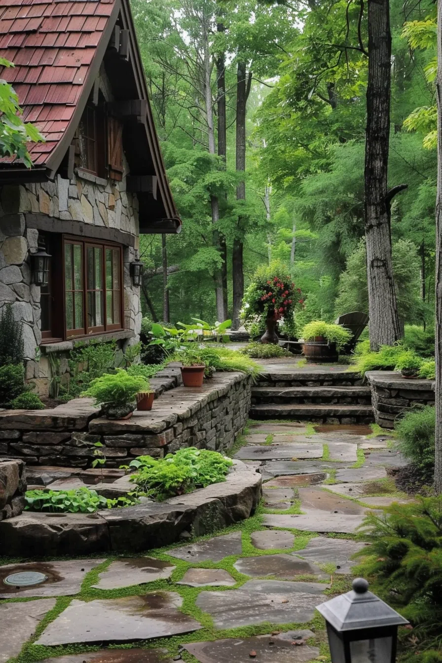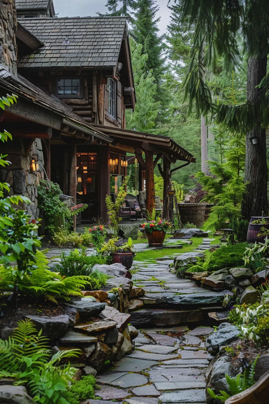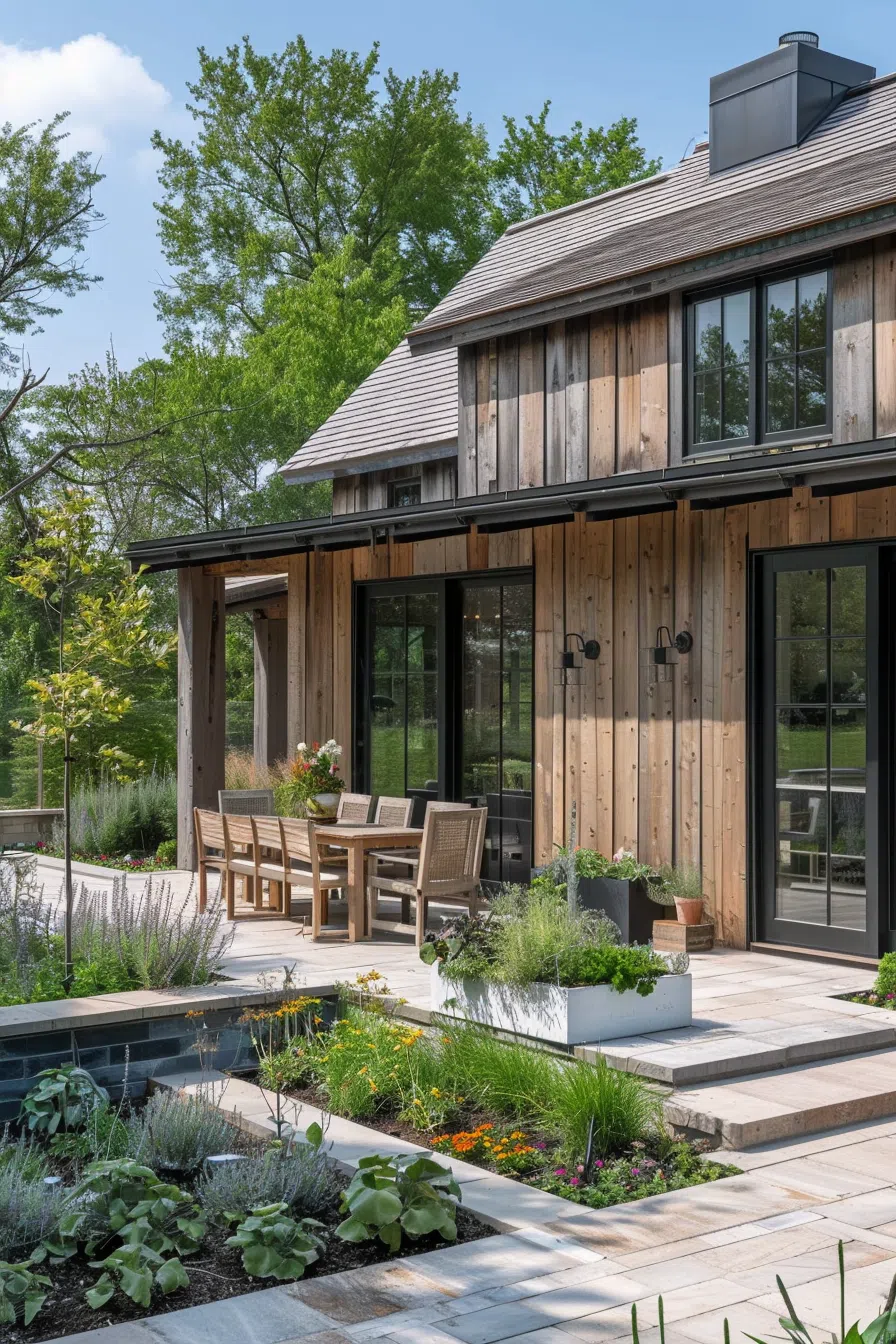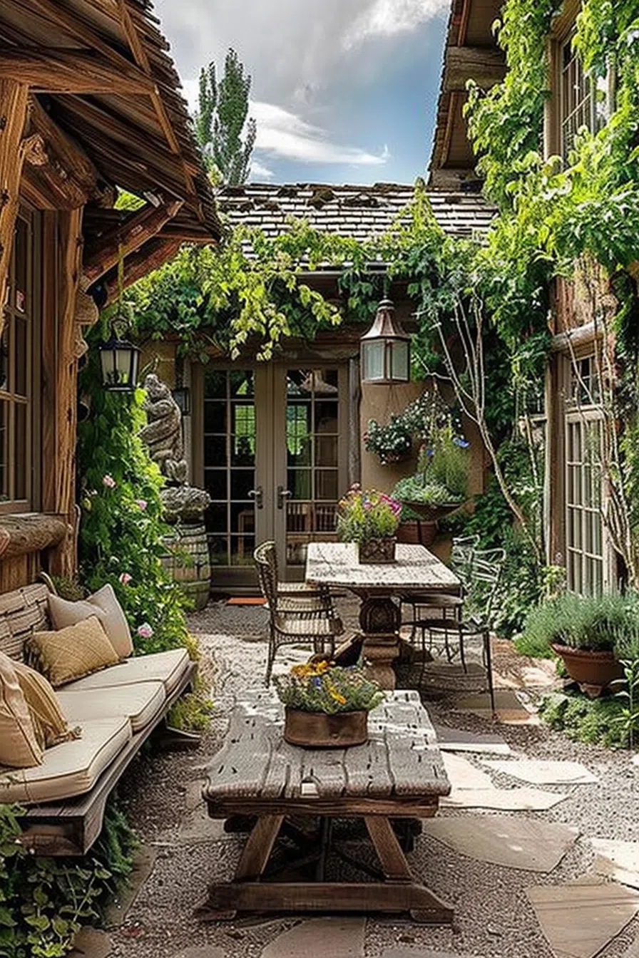 - Landscaping with rustic elements such as weathered wood benches, stone paths, reclaimed wood planters, and rusted metal accents.