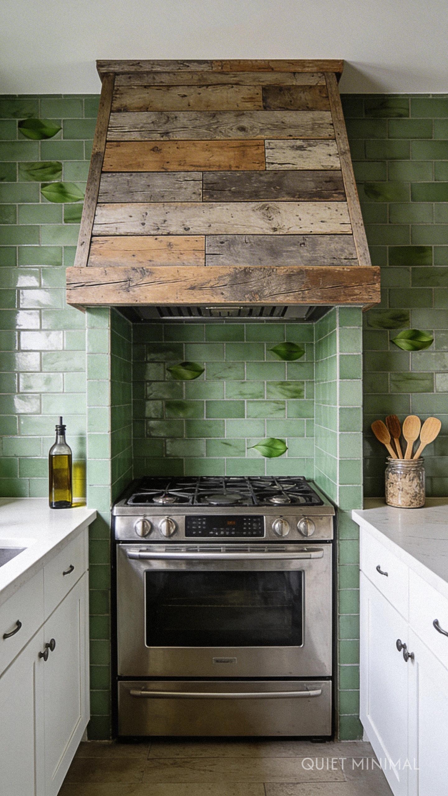 Key Takeaway: A DIY reclaimed wood range hood cover becomes a stunning focal point when framed by subtle, calming eucalyptus green tile or paint.
