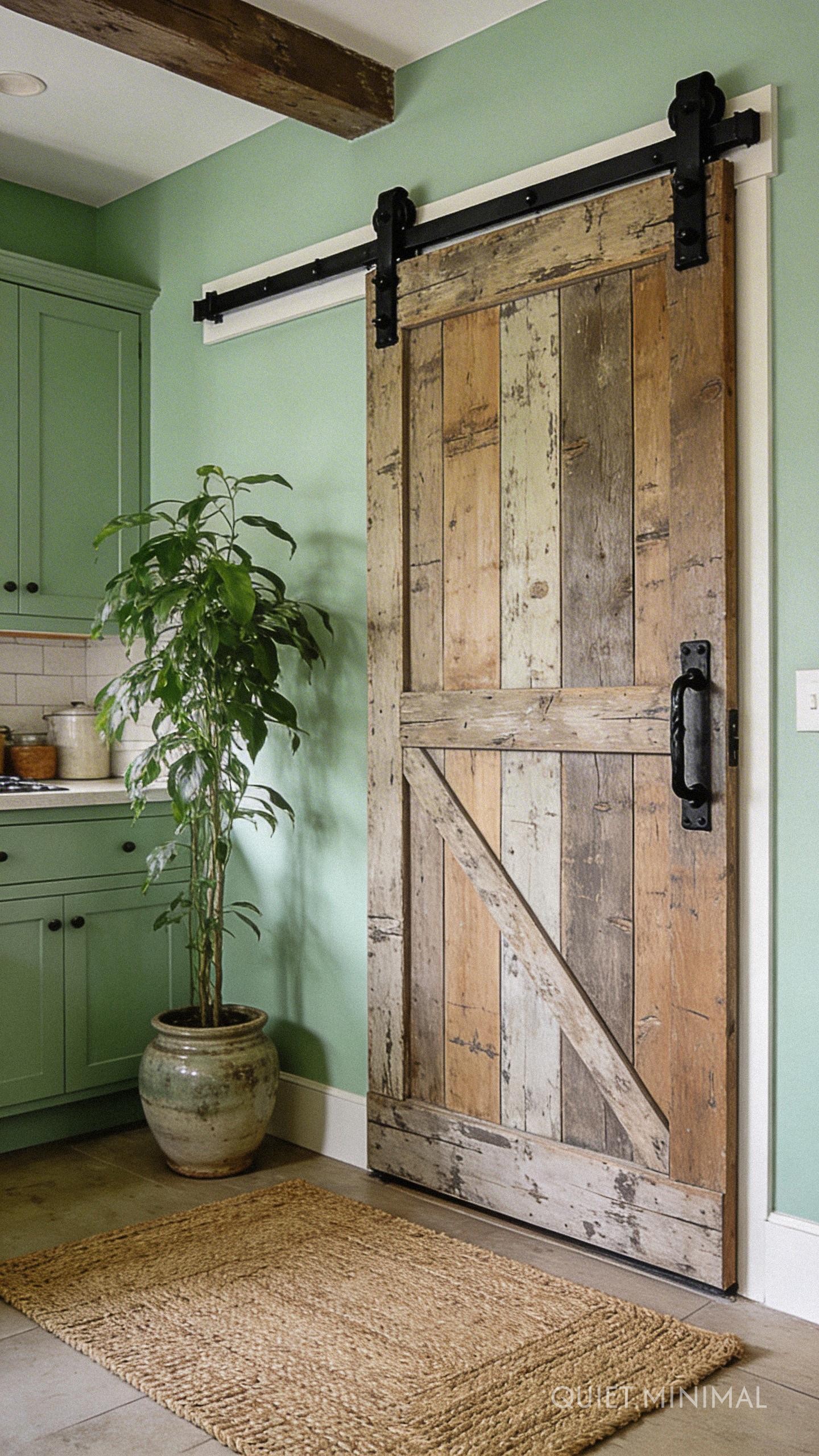 Key Takeaway: Use a statement reclaimed barn door for your pantry and pair it with pale green walls to let the wood’s natural beauty be the hero.