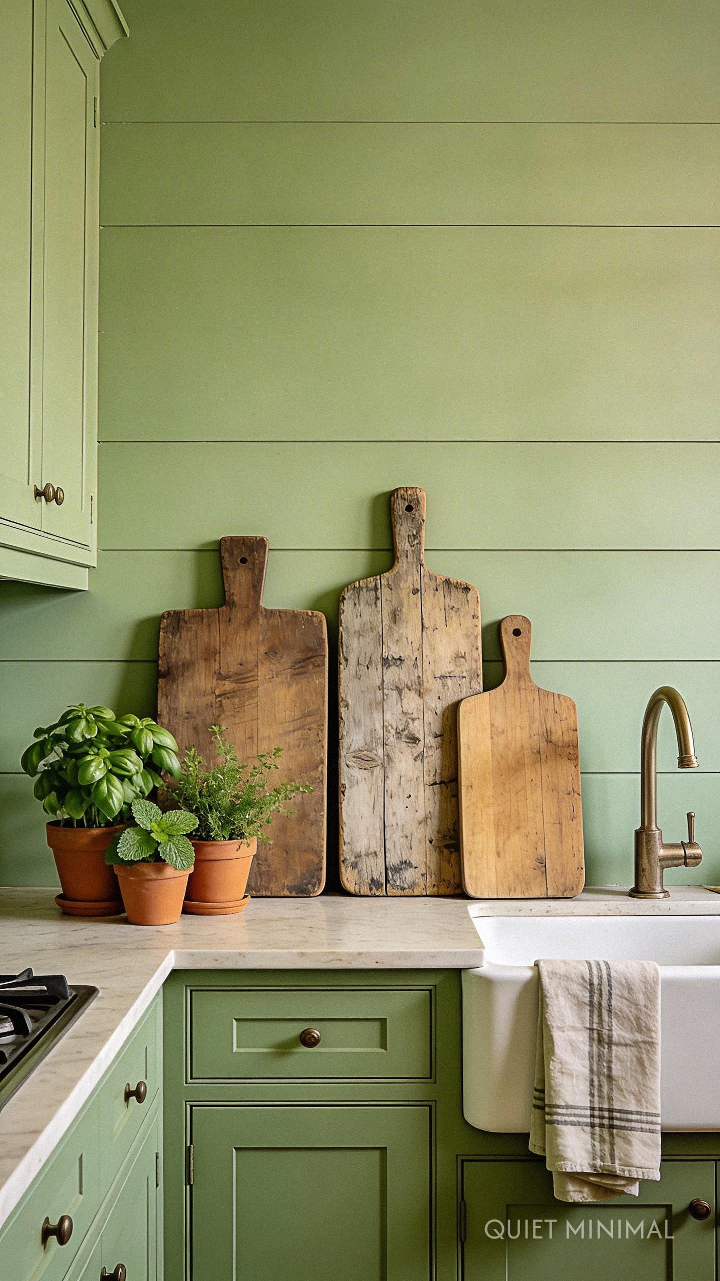 If you’re not ready for a full renovation, you can still capture this aesthetic through thoughtful styling. Start with your existing kitchen and paint the walls a soft, approachable pistachio green. Then, lean a collection of oversized reclaimed wood cutting boards against your backsplash. Mount a small reclaimed wood shelf to hold your favorite olive oils and vinegars. Finally, bring in life with pots of fresh herbs like basil, rosemary, and mint. These small, curated touches work together to build the rustic green vibe without a major commitment.